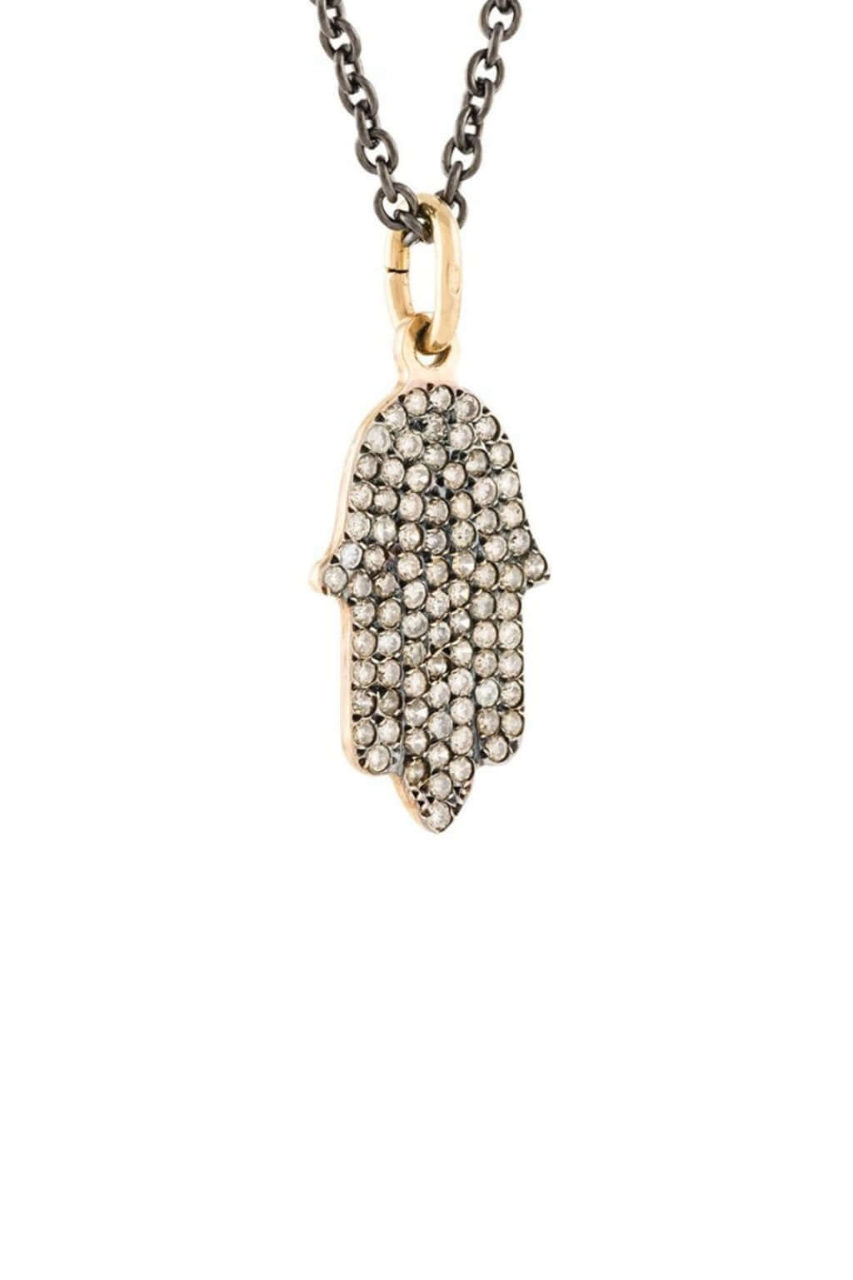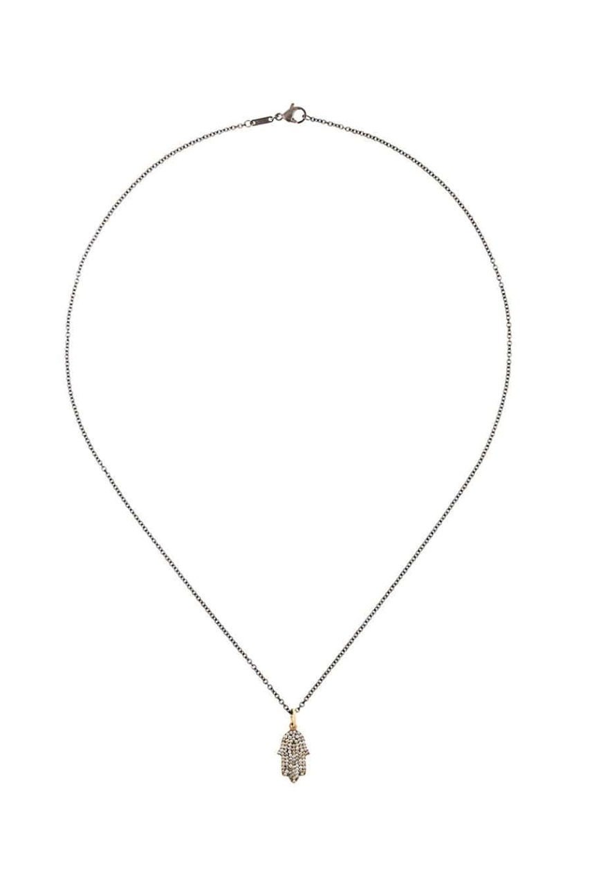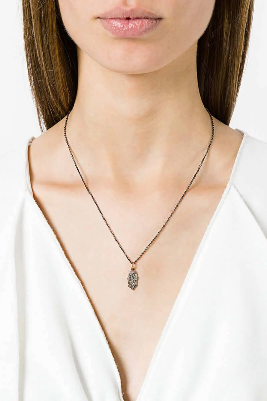 Bring a touch of luck and good fortune into your life with this exquisite Pavé Fatima Hand Pendant. Featuring a handcrafted 18k polished rose gold Fatima hand set with pavé champagne diamonds and oxidized stones for a subtle hue, it is designed to Ileana's signature style and can be paired with a blackened steel chain.