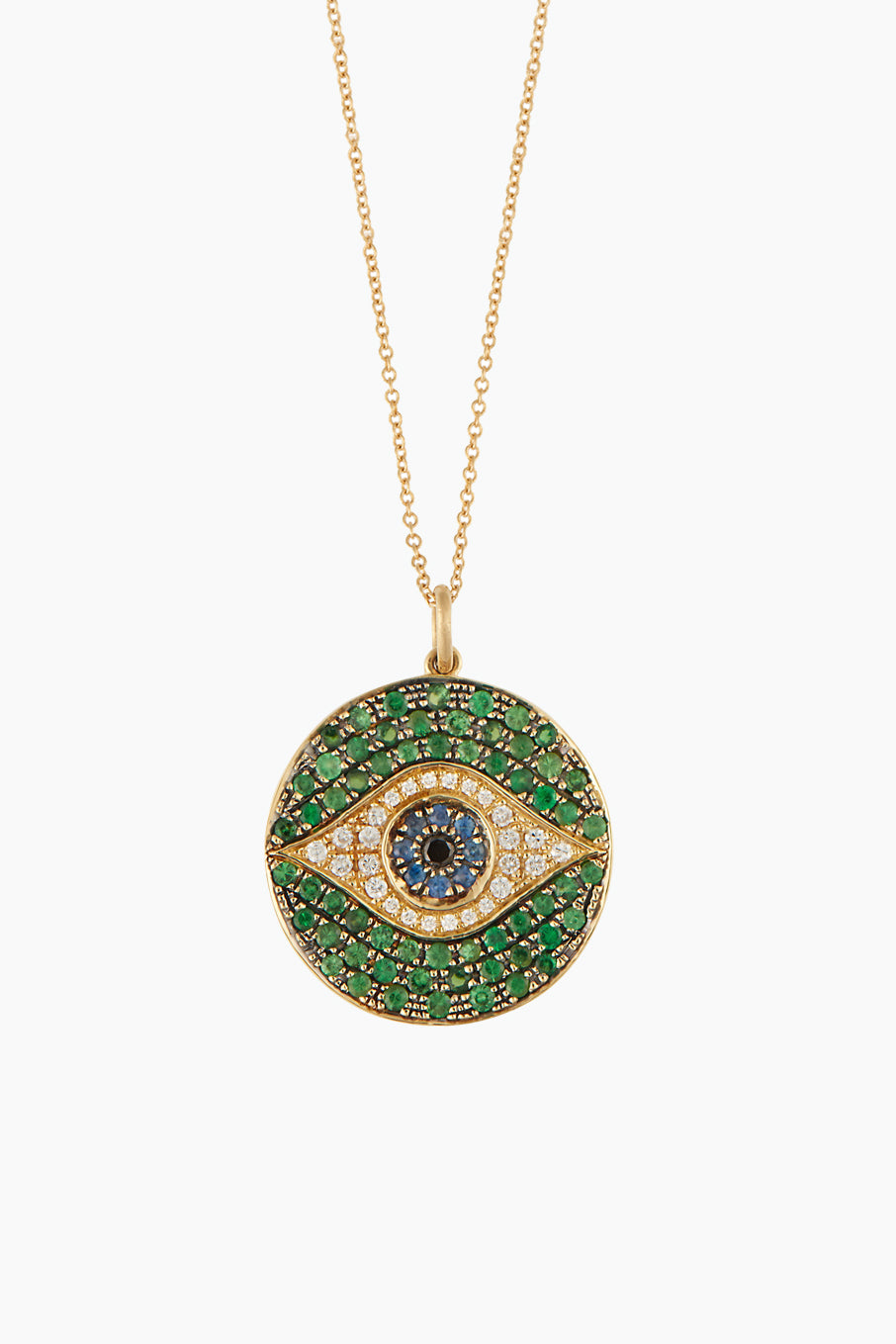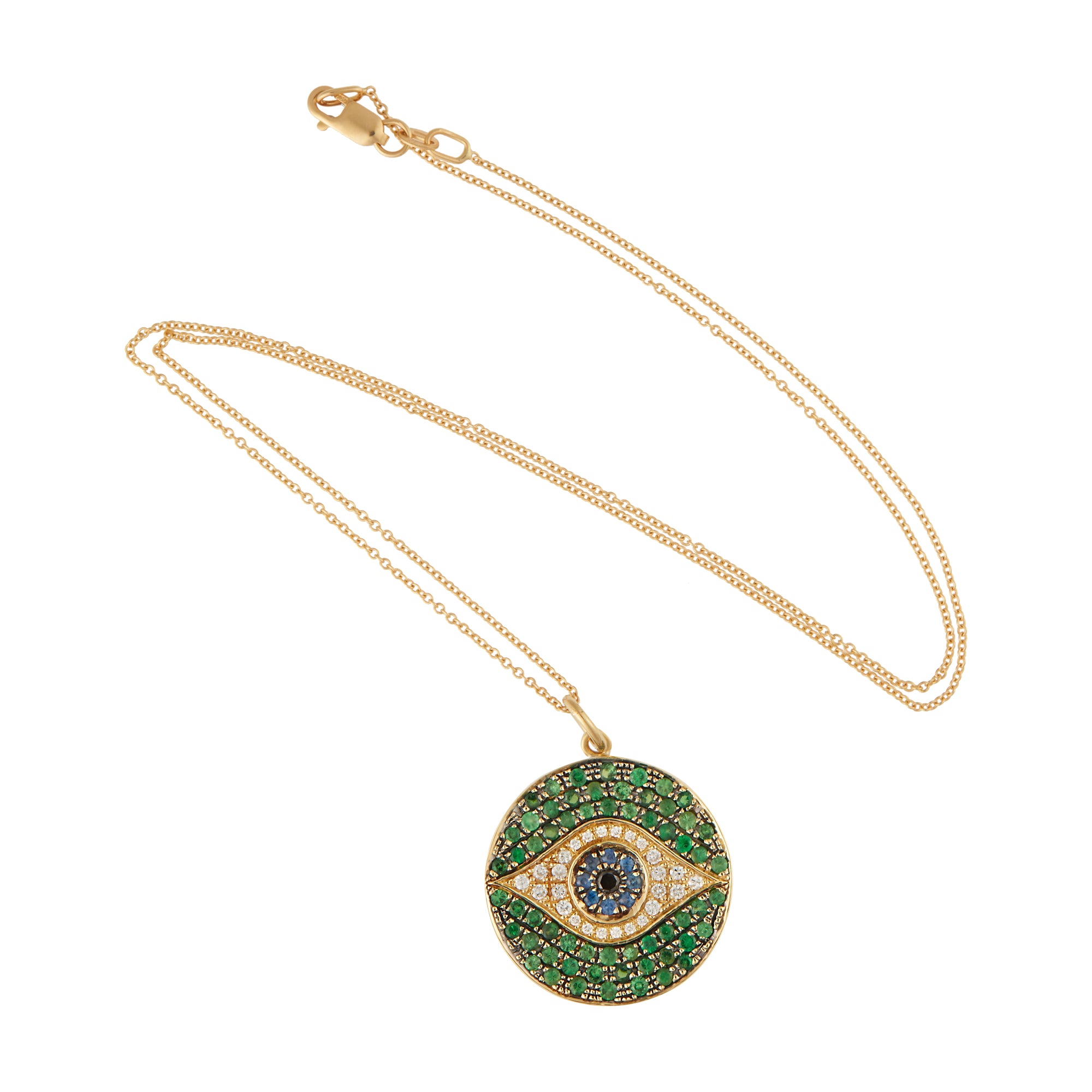 Ileana Makri's classic Green Dawn Pendant is elegantly crafted from 18k yellow gold, showcasing pavé green Tsavorites, white diamond sclera, blue sapphire iris, and a single black diamond pupil at its center.