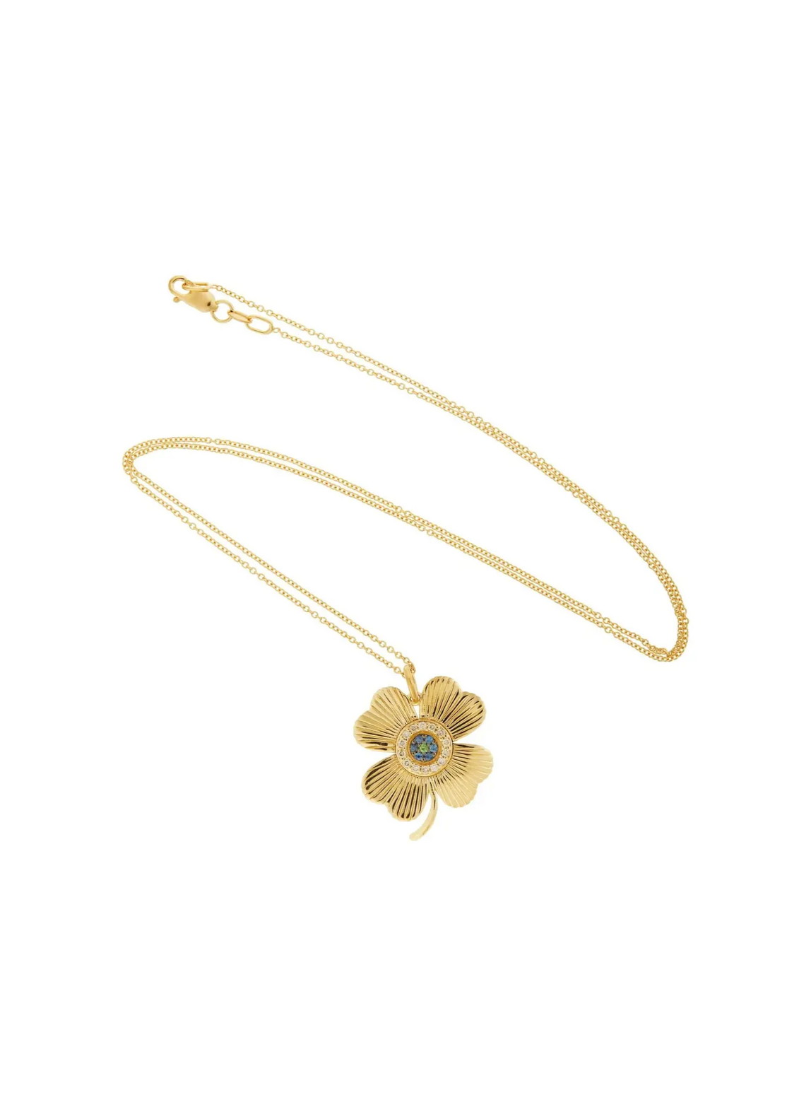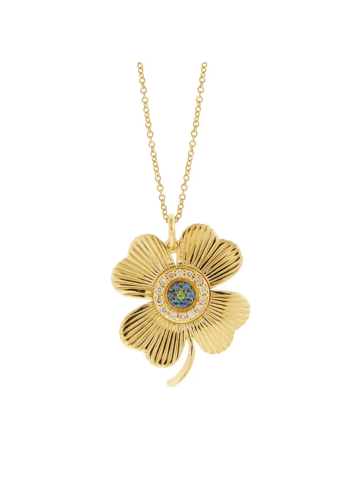 This exquisite Lucky Clover Pendant is crafted from 18k yellow gold and features a hand-carved design set with pavé champagne diamonds, blue sapphires, and a tsavorite "pupil". The eye-catching sparkle and oxidized stones create a stunning look.
