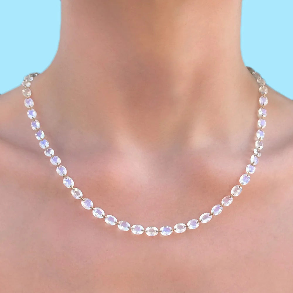 20K Yellow Gold 21” Rainbow Moonstone Lady Like Necklace A Marie-Hélène de Taillac signature design that is both elegant and simple. A strand of luminous oval rainbow moonstones sits beautifully on the decollate. Dimension of stones: 0.5 x 0.8 cm |
