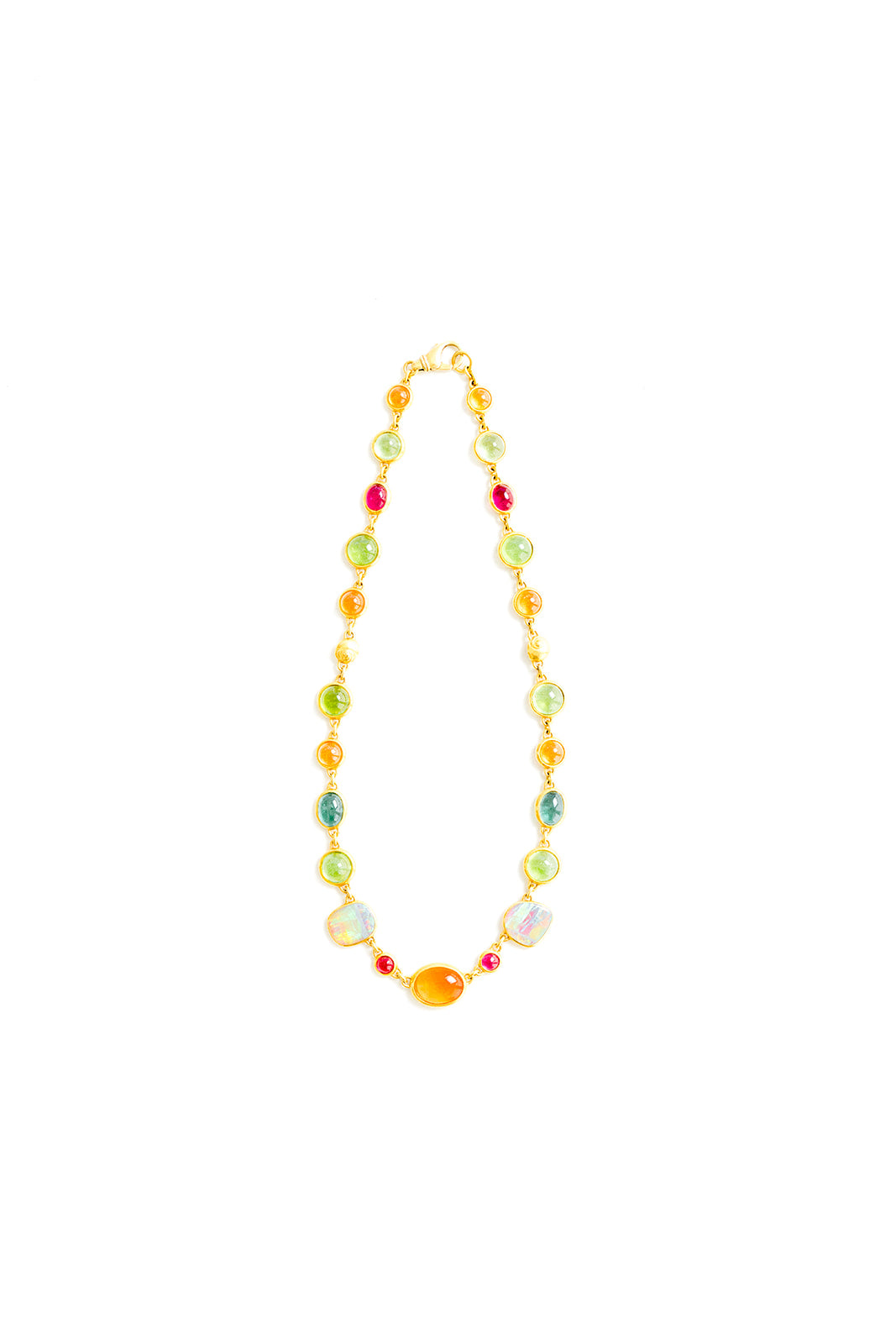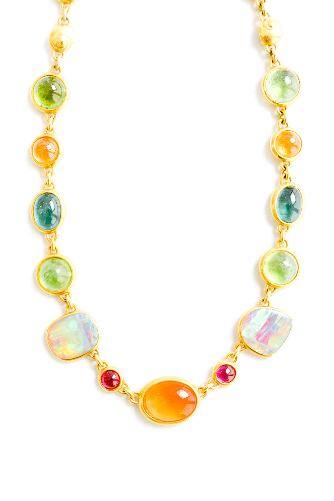 22K Yellow Gold Catalina Necklace with Black Opal, Fire Opal, Peridot, Spessartite, Rubelite and Gold Seashells