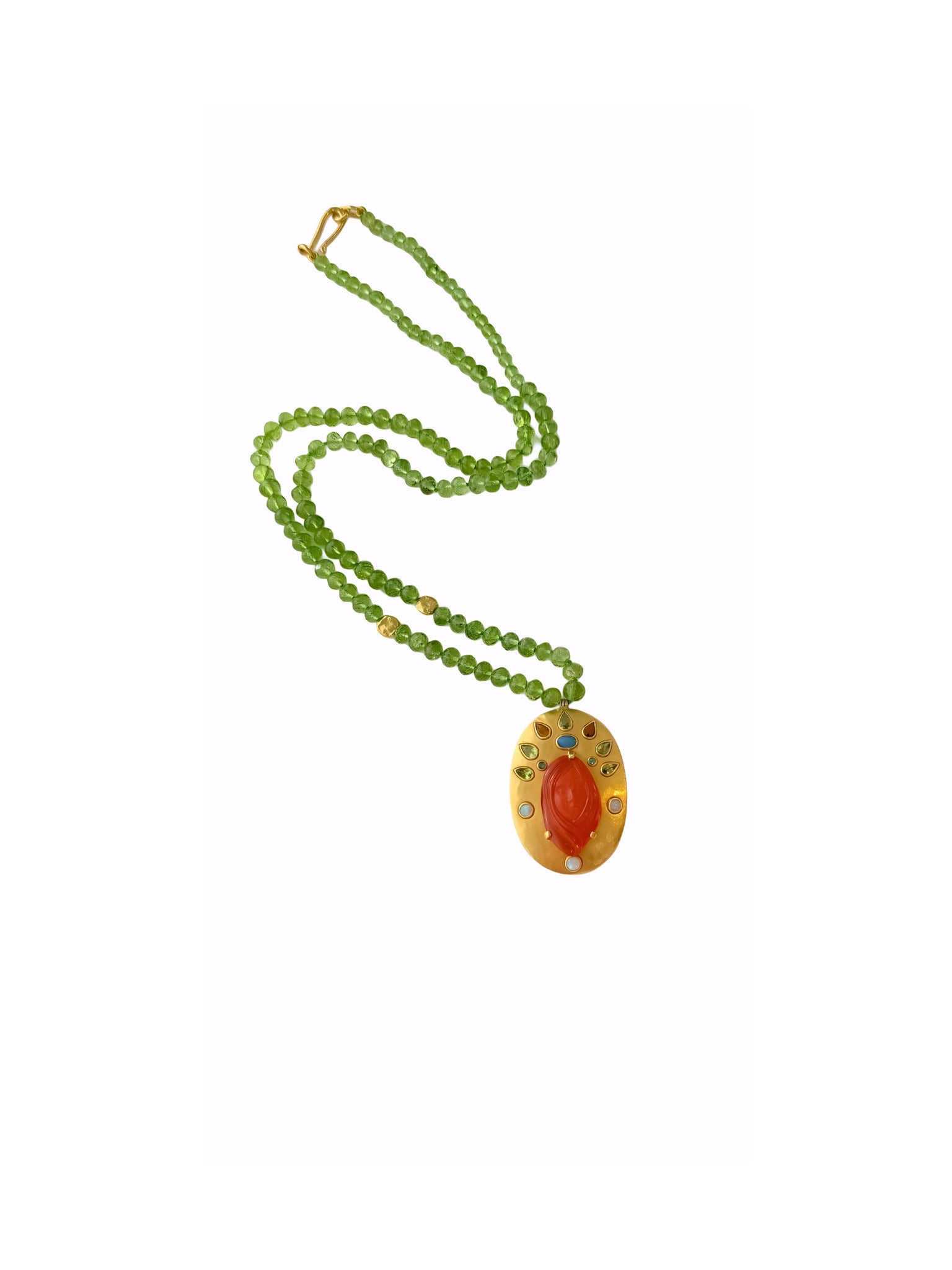 Darlene De Sedle 28" Faceted Peridot Beads Necklace with 2 22K Gold Nuggets and a 22K Sheet Gold Hand Carved Fire Opal Madonna
