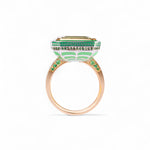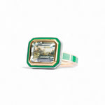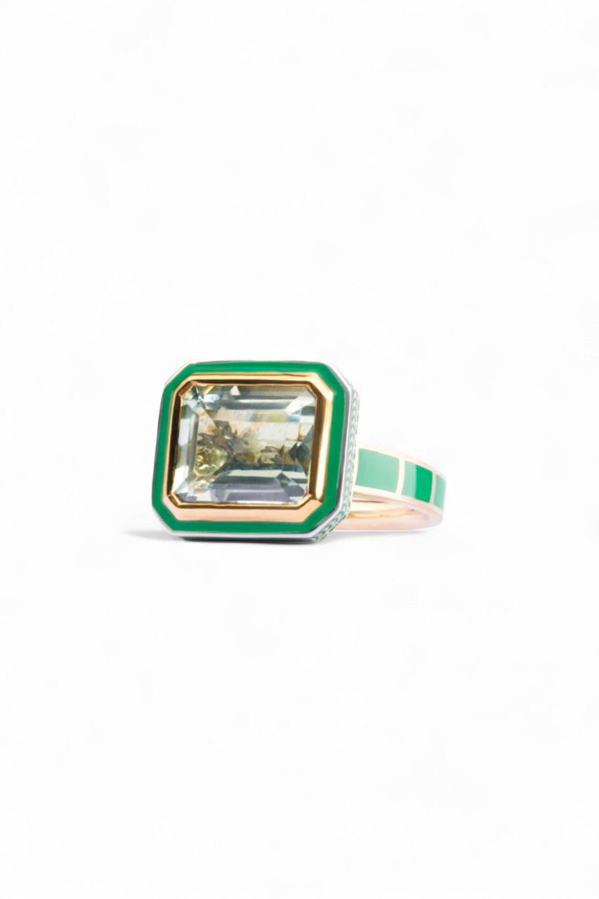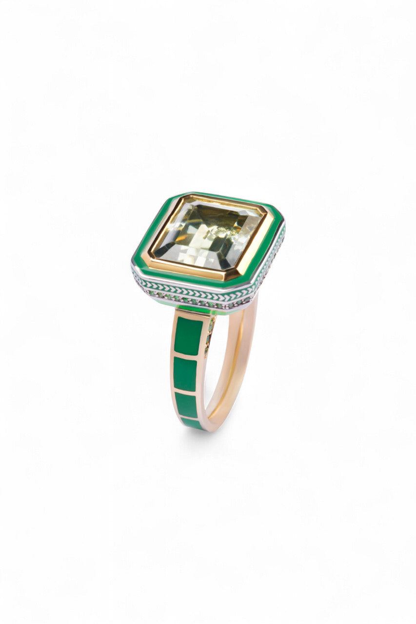 The Silver Tile Imperial Ring blends bold color with refined craftsmanship. Featuring an emerald-cut green amethyst set in a 22ct gold bezel, the design pairs a 14ct yellow gold band with sterling silver, lacquer enamel, and tsavorite accents. Inspired by the tiled temples of Delhi and Uzbekistan, the ring showcases Alice Cicolini’s signature use of vivid enamel and architectural forms. Handmade in London, it is a striking modern statement piece.