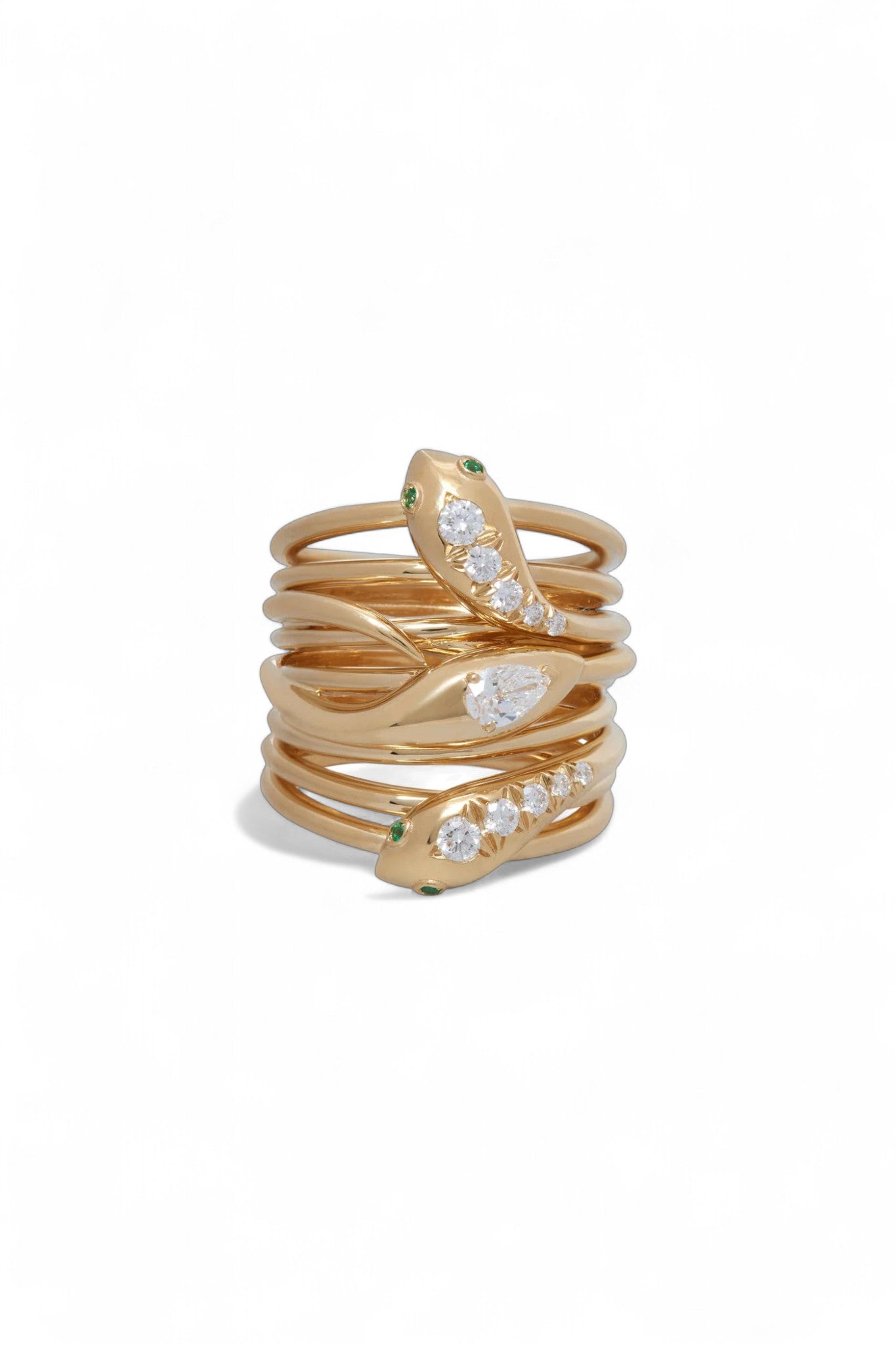 Sidney Garber 18K YG Diamond (0.46 ct) and Emerald (0.02 ct) Three Headed Serpentine Ring. The three-headed snake in this intertwined stacked ring is a sign of luck. It’s sprinkled with diamonds with wise emerald eyes.