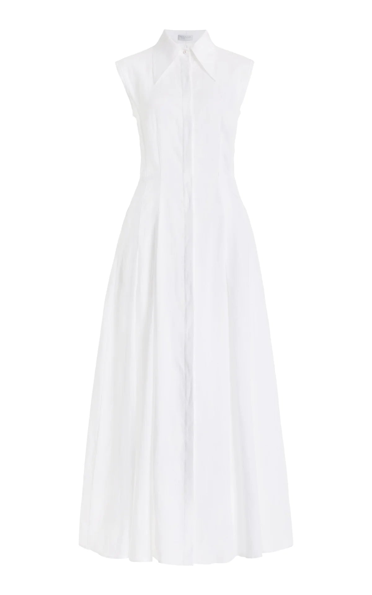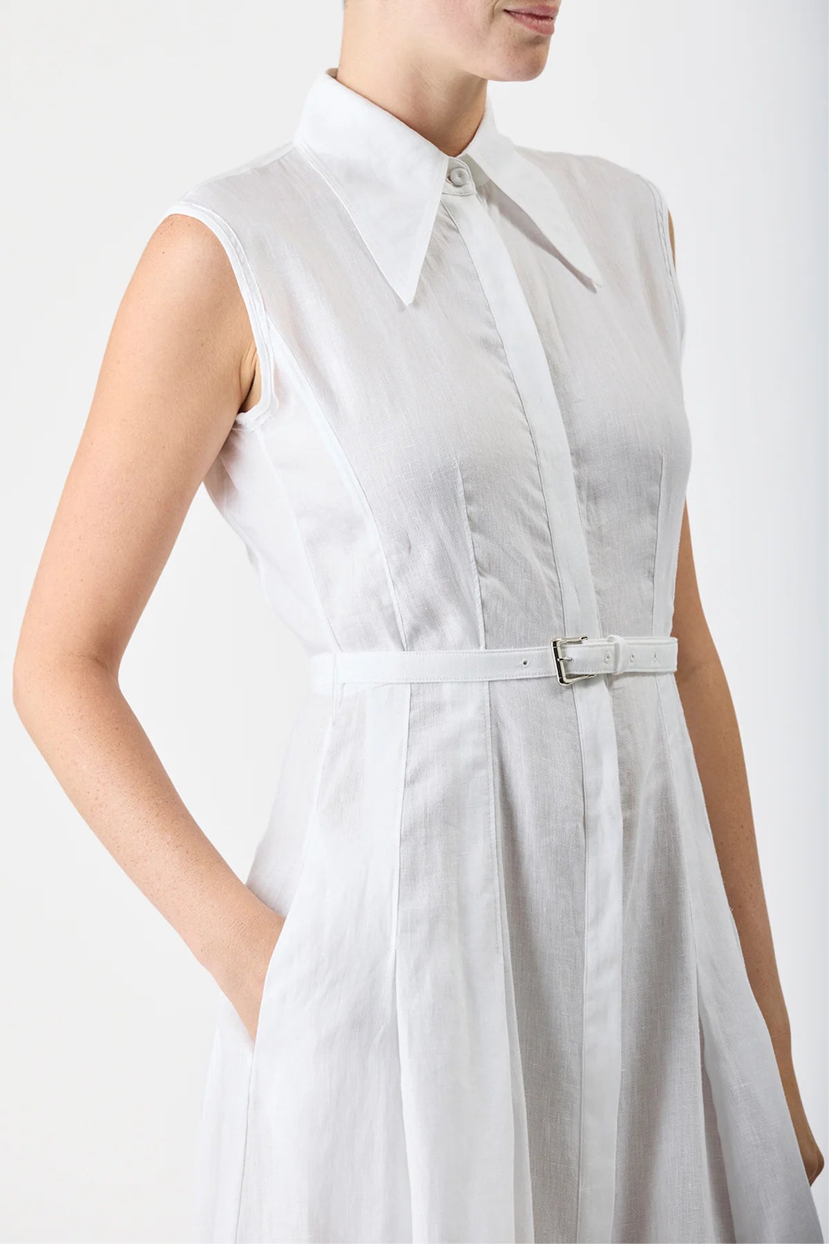 INFO The Durand dress is punctuated with a sharp collar detail, slightly exaggerated with a longer length. Traditional dress shirt finishing and fine stitching make a sharp statement, creating an immaculate contrast against a fuller skirt created by front and back pleat details. In signature GH aloe linen. Details: