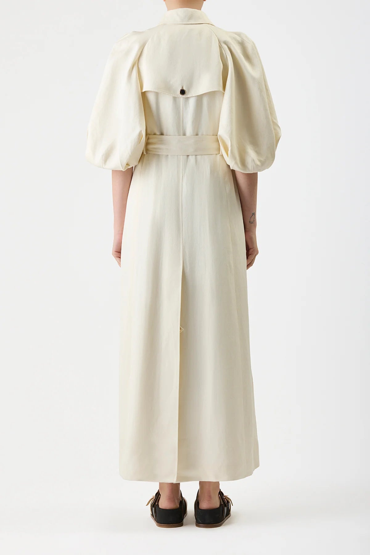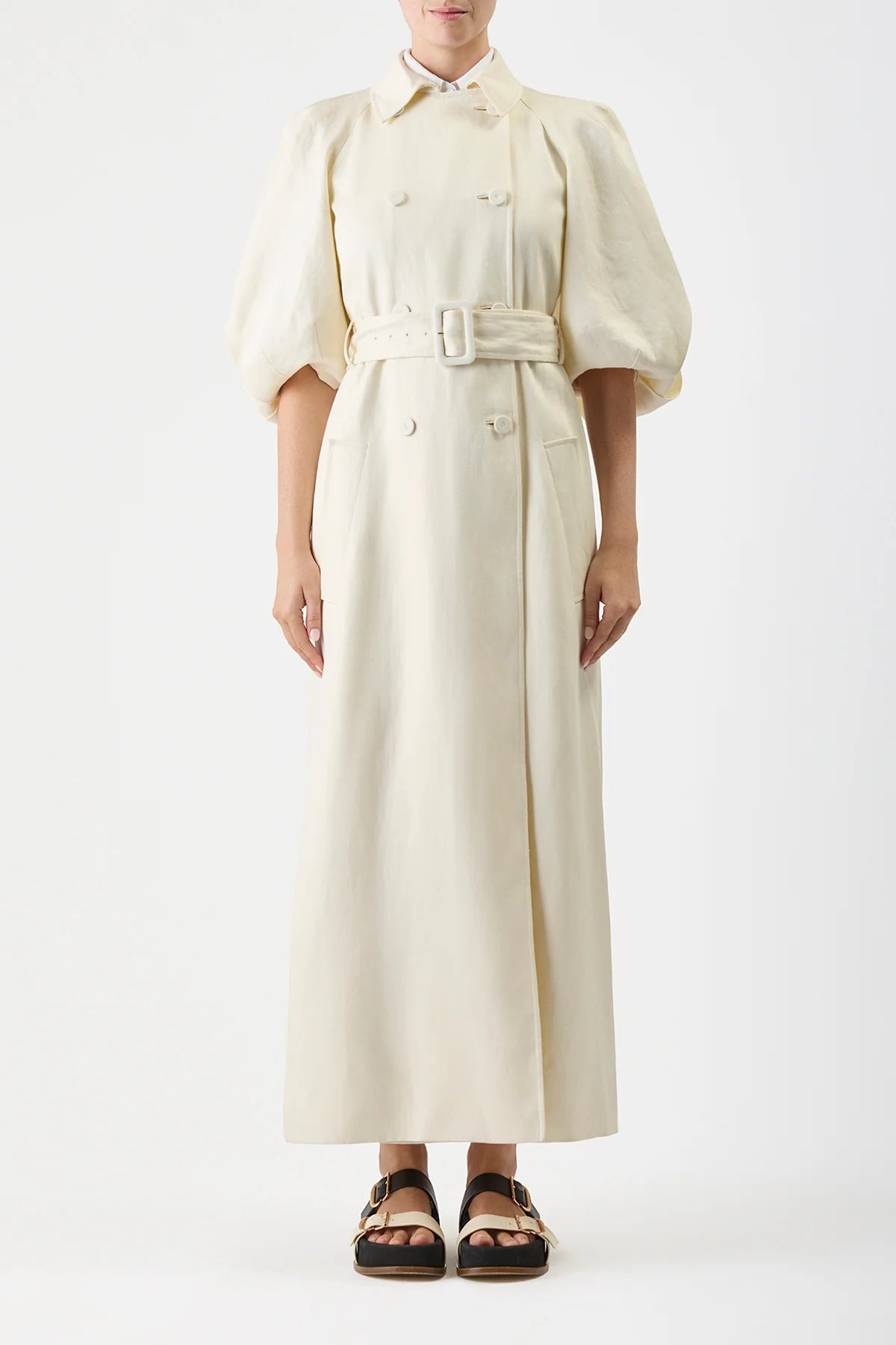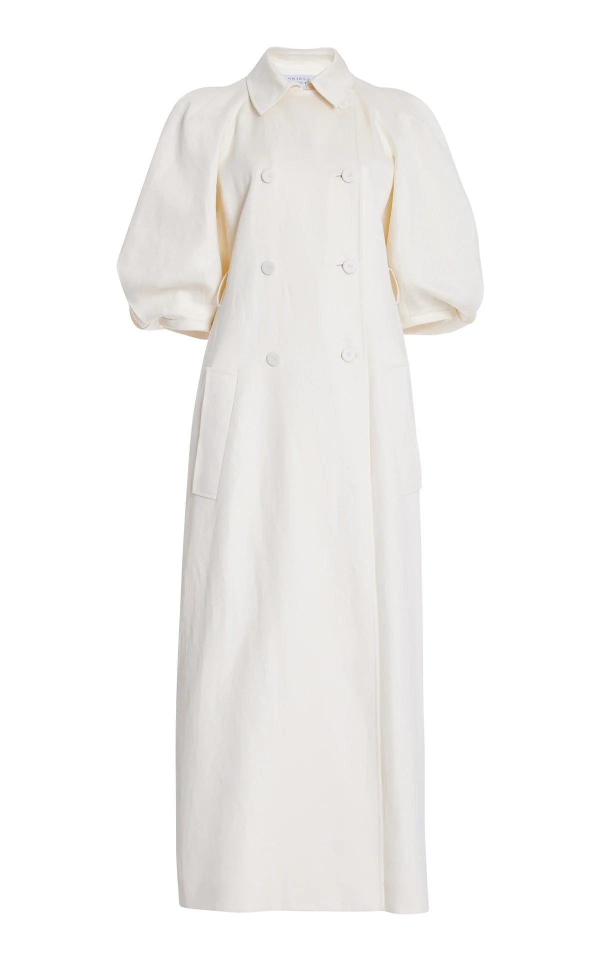 INFO This proud warrior-like double-breasted tailored form boasts sculpted full sleeves that contrast against a fitted bodice. Traditional trench details complete this piece. With self-belt and covered buttons. Details: