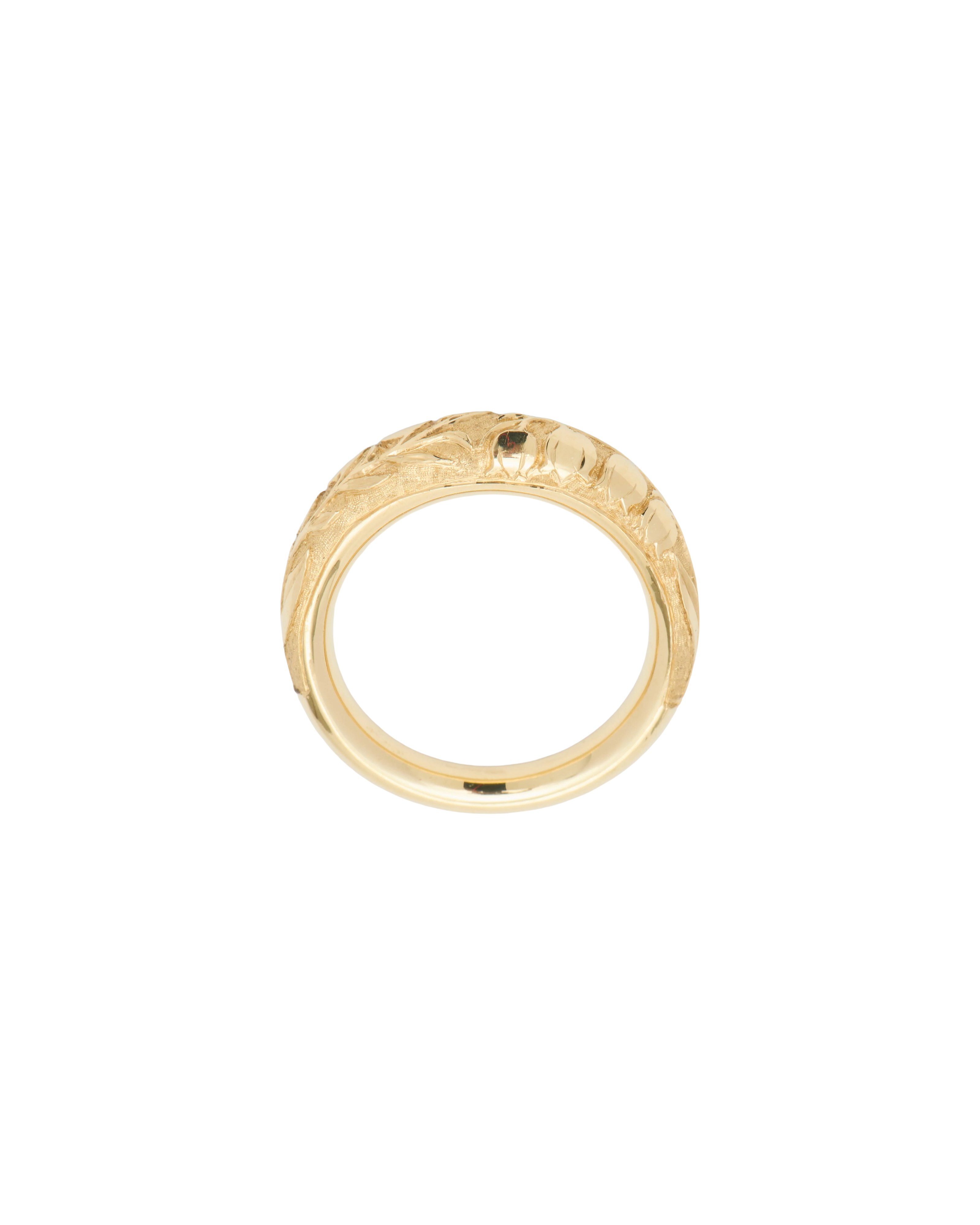 Hargreaves 18K Yellow Gold Fredag Ring features hand-engraved Lily of the Valley detailing in luxurious 18K yellow gold. This distinctive ring celebrates life's meaningful moments—from cherished memories to personal achievements. Each piece is crafted to be uniquely yours, whether adorned with scattered old mine cut diamonds, brilliant modern stones, or inherited gems. Weighing approximately 11g and sized US 7, the Fredag Ring transforms precious moments into wearable art.