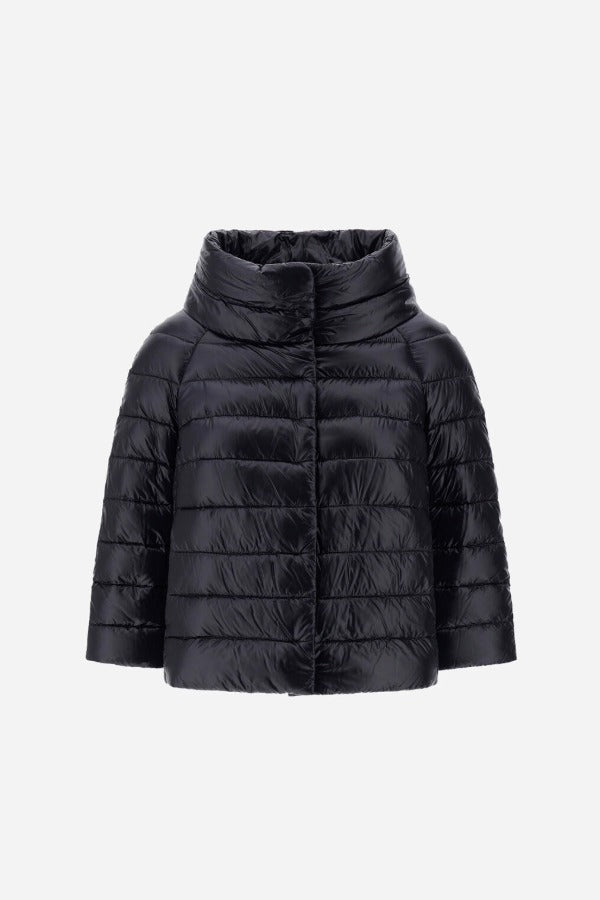Herno Sofia Cape in Cotton, Nylon and Polyester is part of the Fall 25 Collection. Mini cape with bejewelled sleeves and unmistakable style, made from iconic ultralight nylon that embodies what Herno is really all about. An exclusive technology involving 20-denier Japanese nylon and exquisite 90/10 injected down padding for an even lighter feel. The resulting garment provides decent resistance to water and a particularly luxurious, silk-like feel.