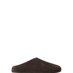 The Row Hudson Suede and Shearling Slide is part of the Fall 25 Collection. Relaxed slip-on shoe in natural suede and soft shearling with round toe, contoured footbed, and rubber sole.