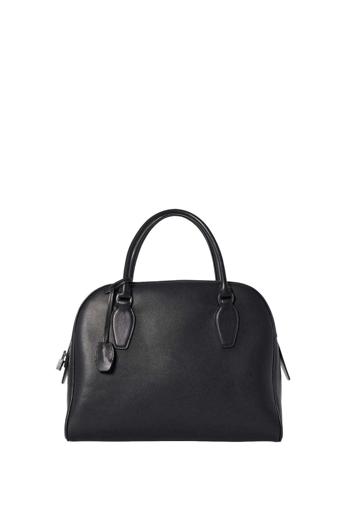 The Row India 12 Bag is a part of the Fall 25 collection. Updated bowling bag in polished saddle leather with tubular handles, branded metal padlock and key, and zipper closure.