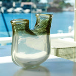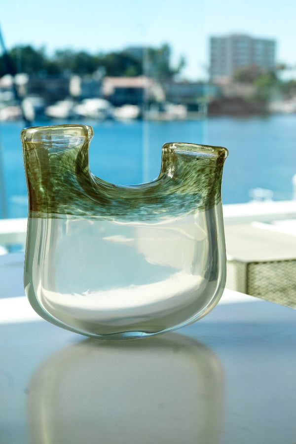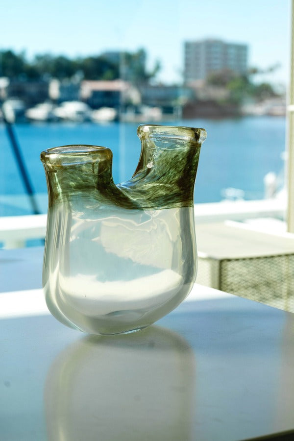 Hugh Findletar Twin Neck Murano glass Vase was worked with 8 different masters to create the double neck. This is the first of its kind. Gorgeous with two lily's and it comes to life. Or a small tree limb and some roses on the other end.