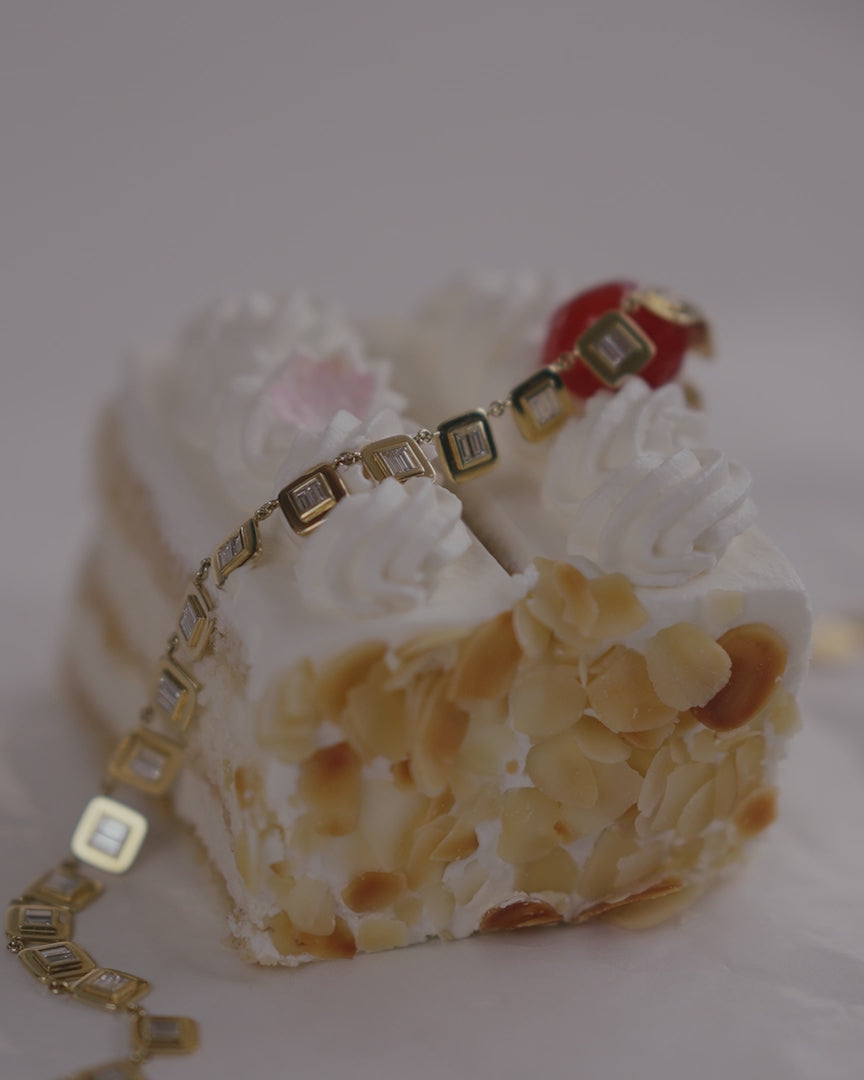 This Elegant and timeless Tile Necklace by Ileana Makri is handcrafted from 18k yellow gold featuring a shimmering row of polished gold tiles, each encrusted with two sparkling baguette white diamonds. Symbolizing sophistication and elegance, this exquisite piece is a classic addition to any fine jewelry collection.