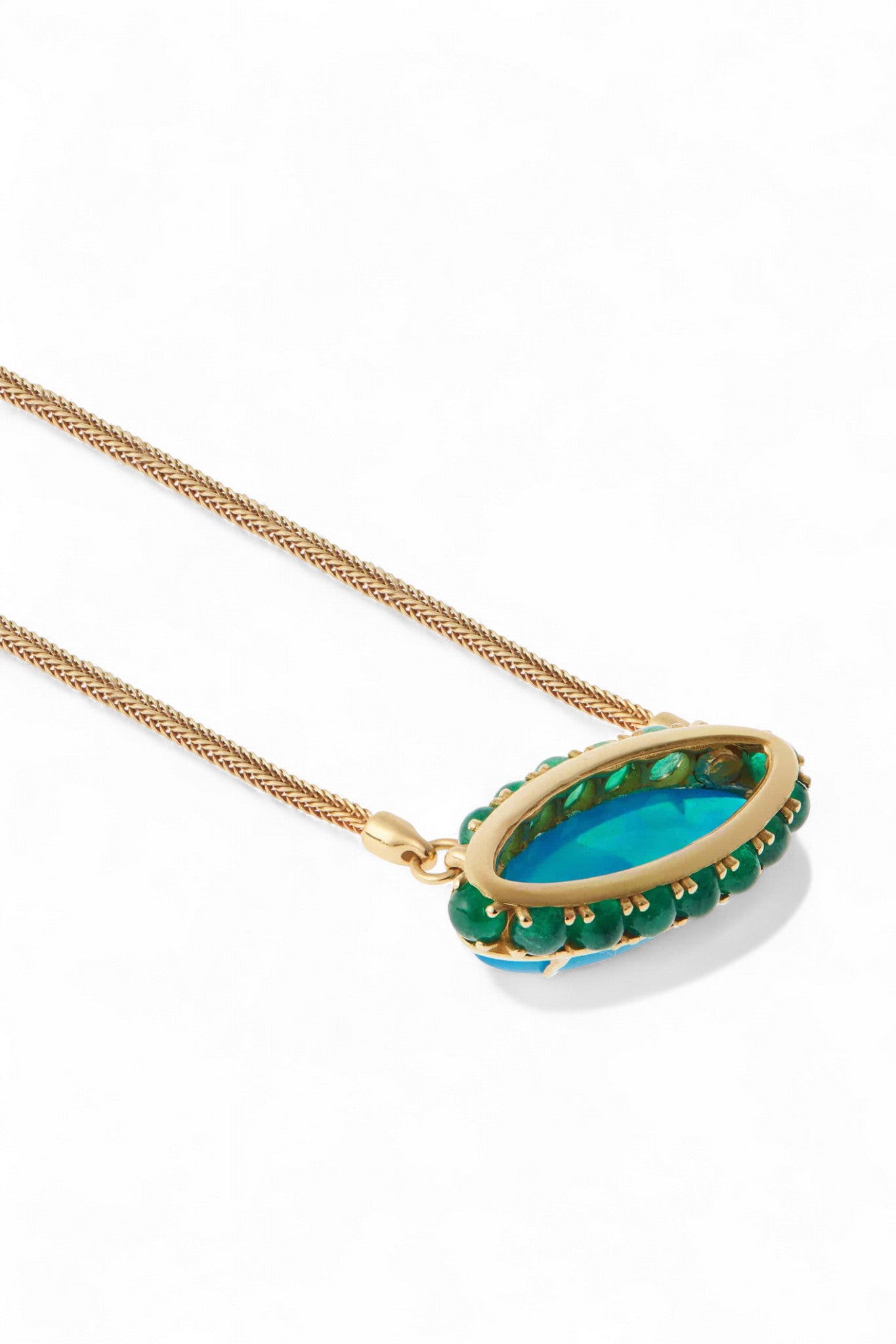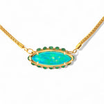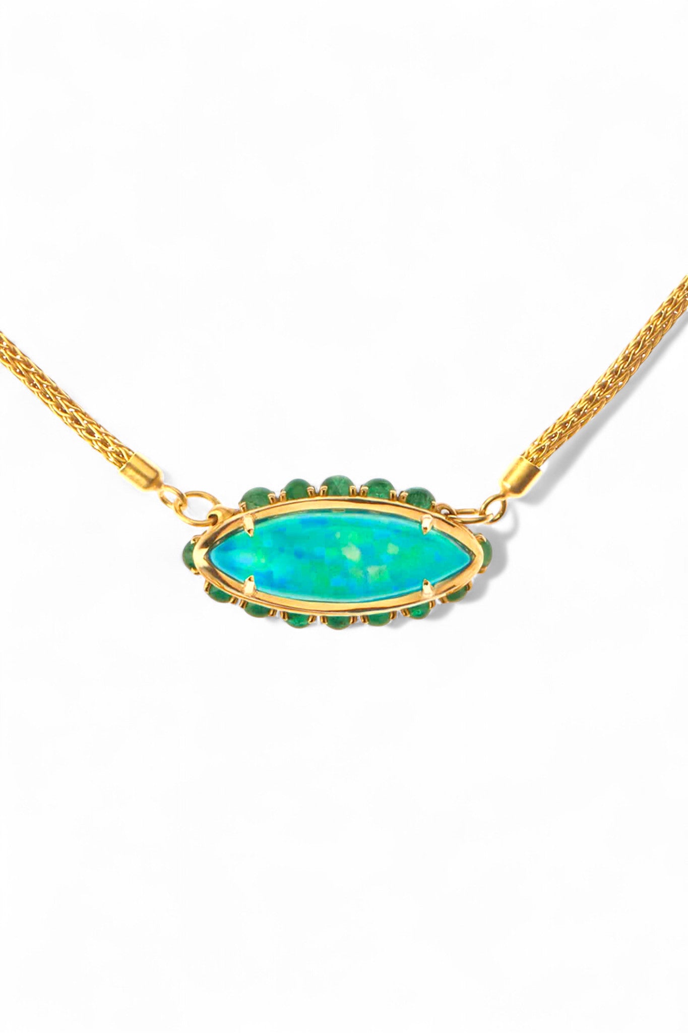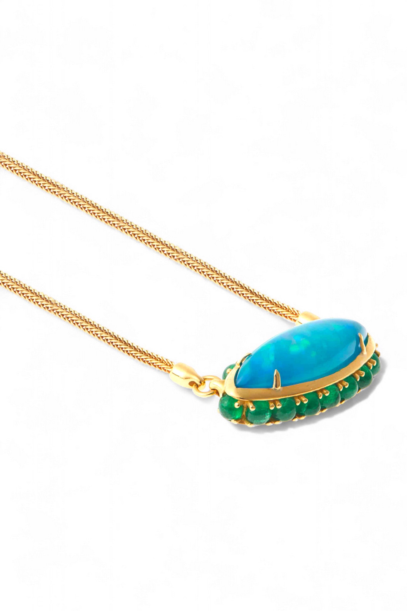 A wash of hypnotic blue catches the light in Ileana Makri’s Blue Lagoon Necklace. Handcrafted in 18k yellow gold, a luminous 24.95-carat Australian opal floats at the center, framed by cabochon emeralds for a subtle halo of warmth. Suspended from a supple hand-woven gold mesh chain, this effortless strand drapes beautifully—with no clasp to interrupt its fluid line. A modern talisman with natural allure.