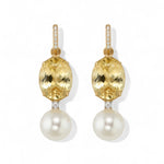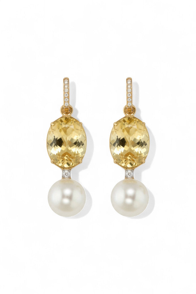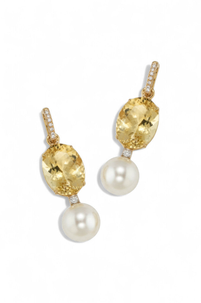A breathtaking expression of refined luxury, these Irene Neuwirth earrings are handcrafted in 18K yellow and white gold and set with radiant golden beryl gemstones totaling 20.81 carats. The warm, honeyed glow of the beryl is complemented by luminous 12.5mm South Sea pearls, celebrated for their exceptional luster and smooth, elegant surface. Full cut diamonds and delicate diamond pavé detailing add a sophisticated shimmer, enhancing the timeless allure of this heirloom-worthy design. Bold yet undeniably feminine, these earrings are an exquisite addition to a curated fine jewelry collection.
