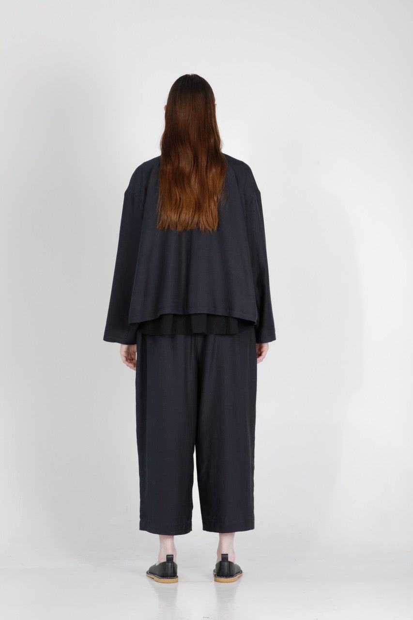 Double-breasted cropped blazer with unstructured dropped shoulders.