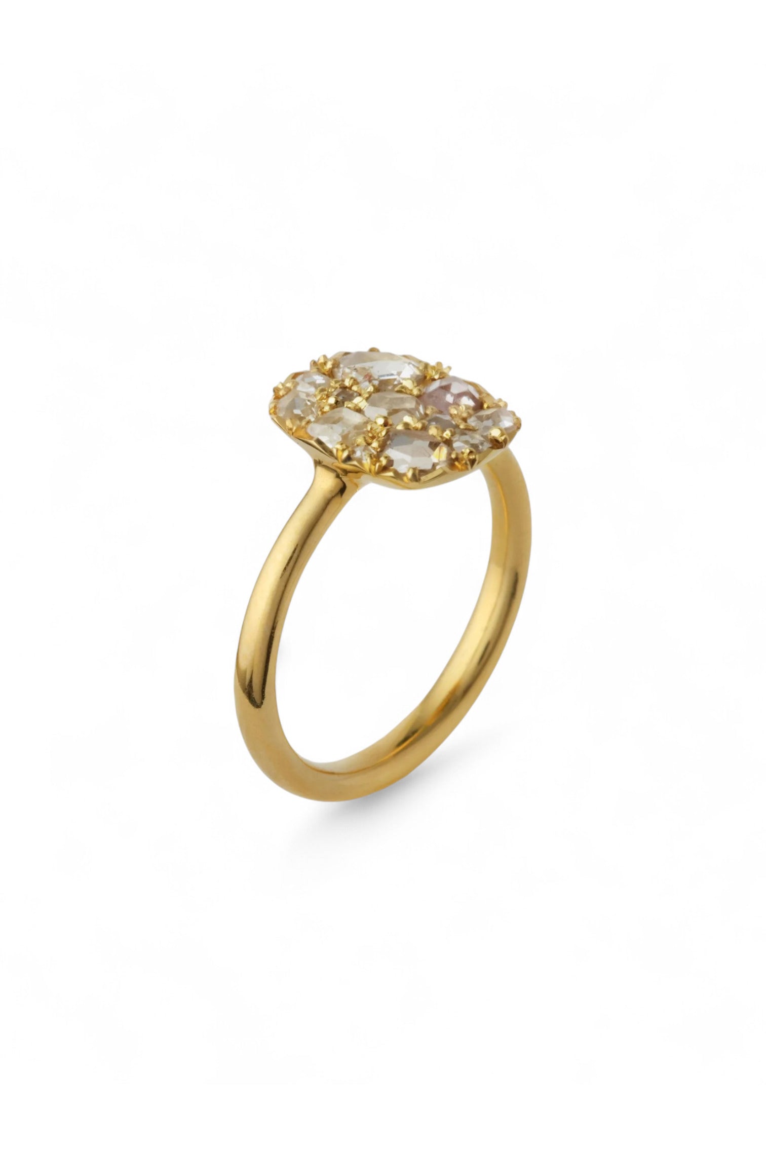 A ring alive with poetry and quiet power. Hargreaves Stockholm’s Into the Wild Classic Ring carries the shimmer of early morning dew and the hushed mystery of a forest just waking. Antique rose-cut diamonds—each rescued, each with stories of their own—form a soft scatter of light across a hand-finished golden landscape. Beneath, a signature engraved starburst rests against the skin, a secret known only to the wearer.