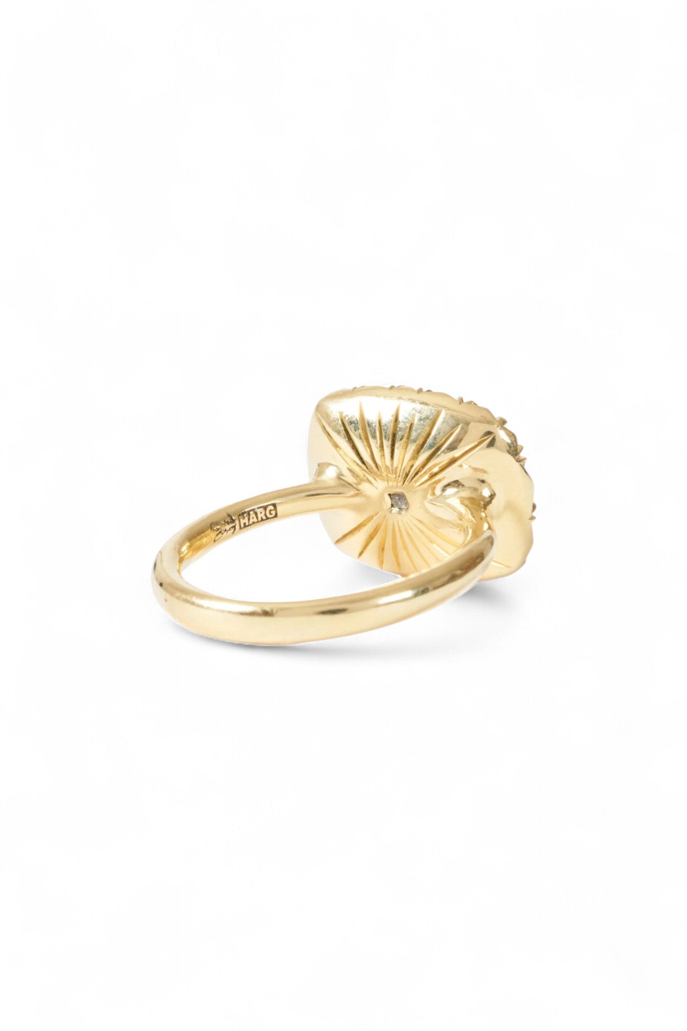 Hand-finished details reveal the maker’s touch: a hidden starburst engraving on the underside, just for the wearer. A modern relic, luminous and poetic, meant to be lived in.