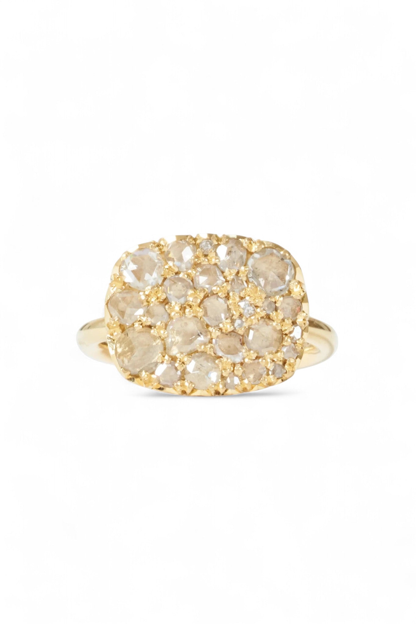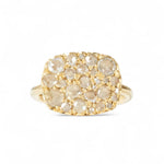 A quiet treasure from the heart of Stockholm. The Into the Wild East West Ring captures the raw romance of antique rose-cut diamonds, scattered like stardust across a soft, sculpted bed of 18k yellow gold. Low-profile and effortless, it sits close to the skin—an everyday piece with heirloom soul.