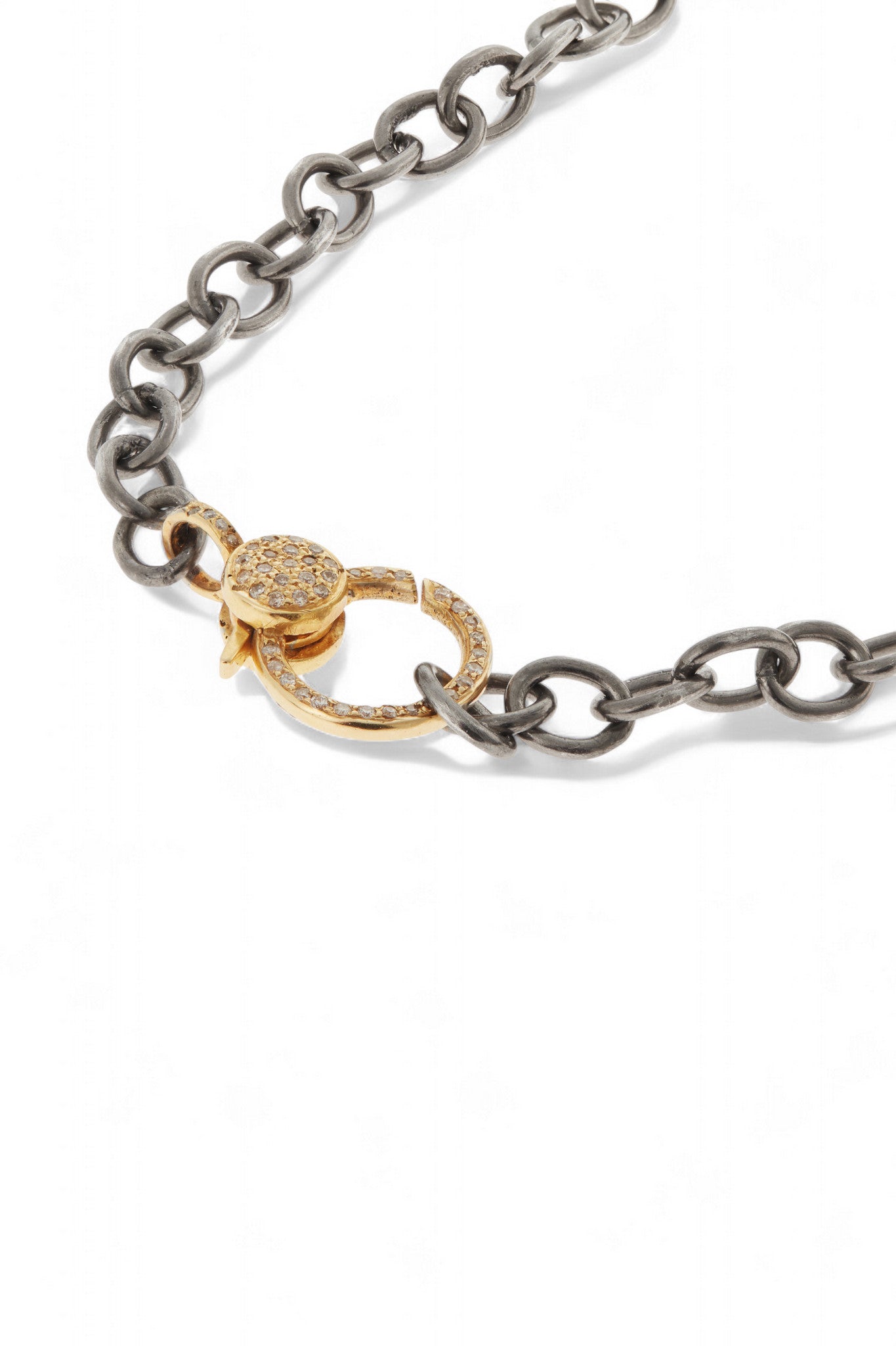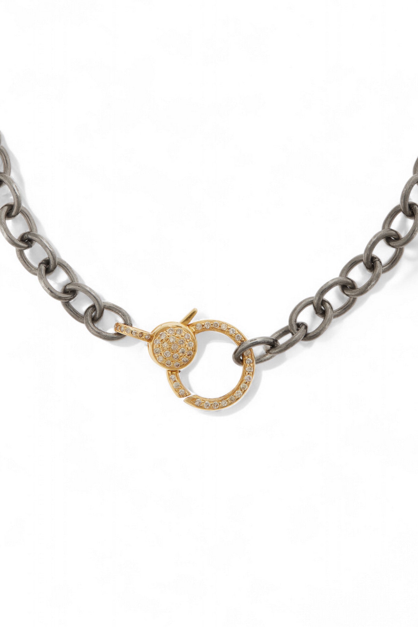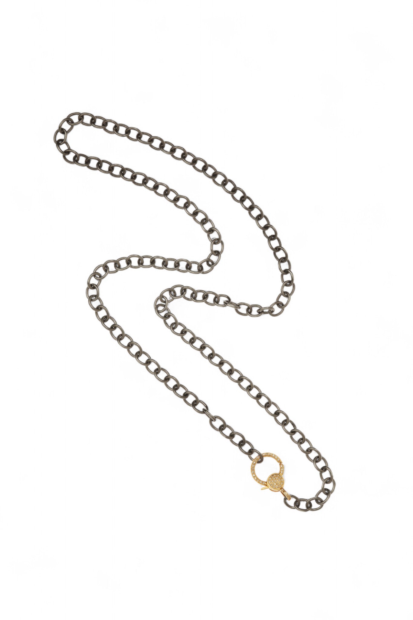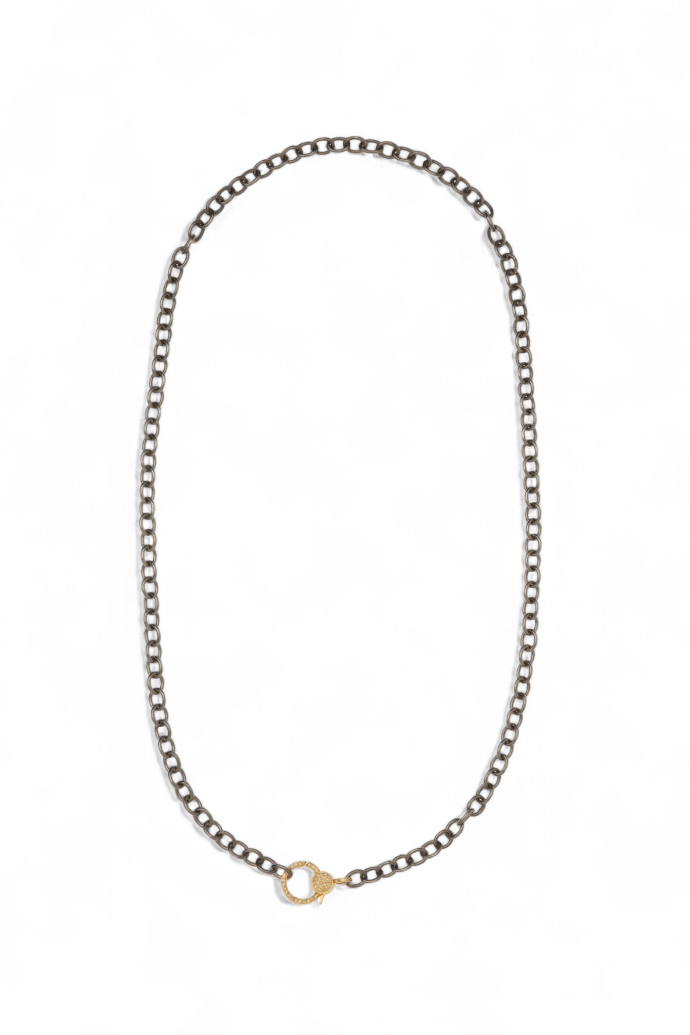 Understated and endlessly versatile, Ileana Makri’s Round Link Chain is crafted from oxidized sterling silver for a rich, sculptural finish. The look is completed with a 14k yellow gold clasp, pavé-set with TTLB diamonds for a subtle flash of brilliance. Wear it alone for a minimal statement or add your favorite charms to make it your own. A timeless essential with a touch of Makri’s signature edge.