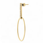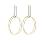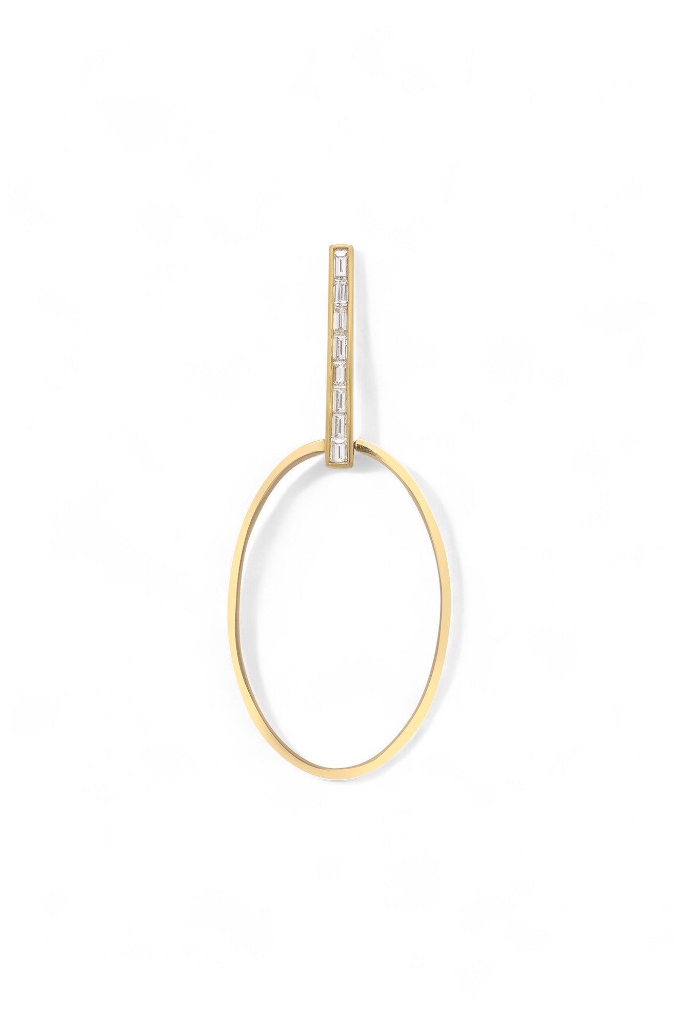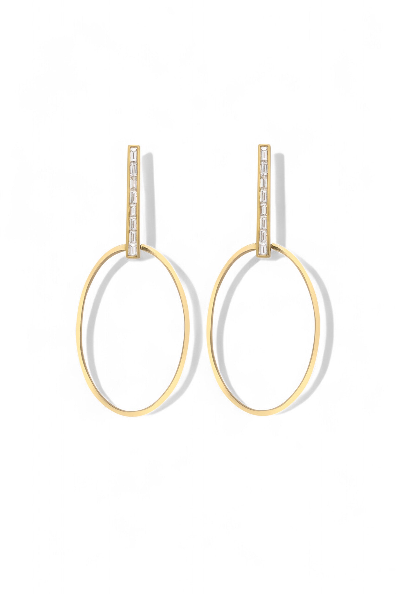 Modern, sculptural, and deeply refined — the Sprinkles Orbit Diamond Earrings bring together the clean geometry of elongated gold forms with the quiet brilliance of baguette-cut diamonds. Each earring features a vertical line of channel-set white diamond baguettes that catch light with an understated, architectural shimmer, suspended above a perfectly weighted open oval hoop. Handcrafted in 18k polished yellow gold, the silhouette feels both minimal and luxuriously elevated, making it an effortless statement from day to night.