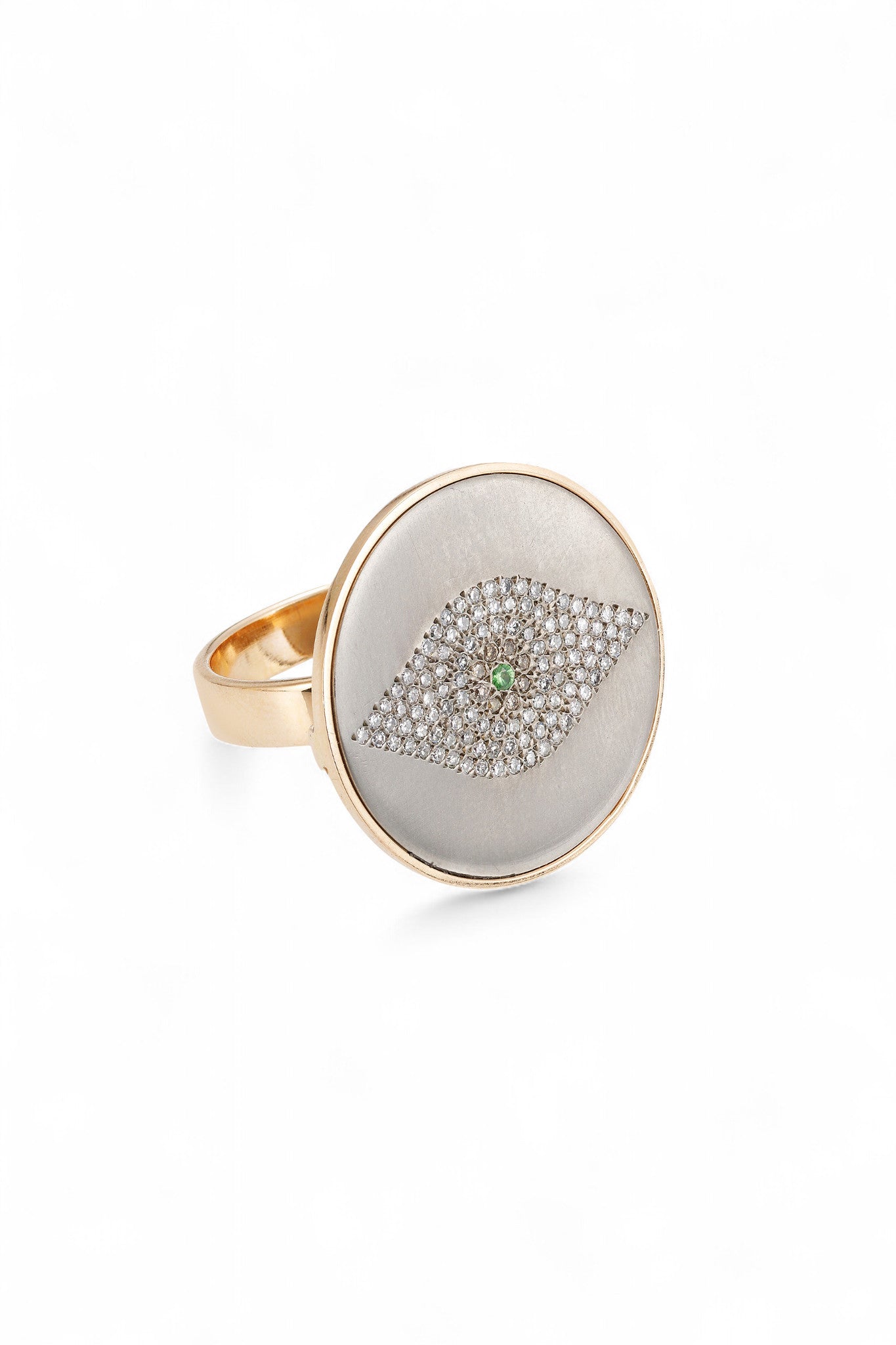 The perfect statement of elegance and sophistication: this 18K Rose Gold and Titanium Dawn Ring from Ileana Makri is Exquisitely set with 0.47cts of white and champagne diamonds and tsavorites, it is a timelessly beautiful accessory.