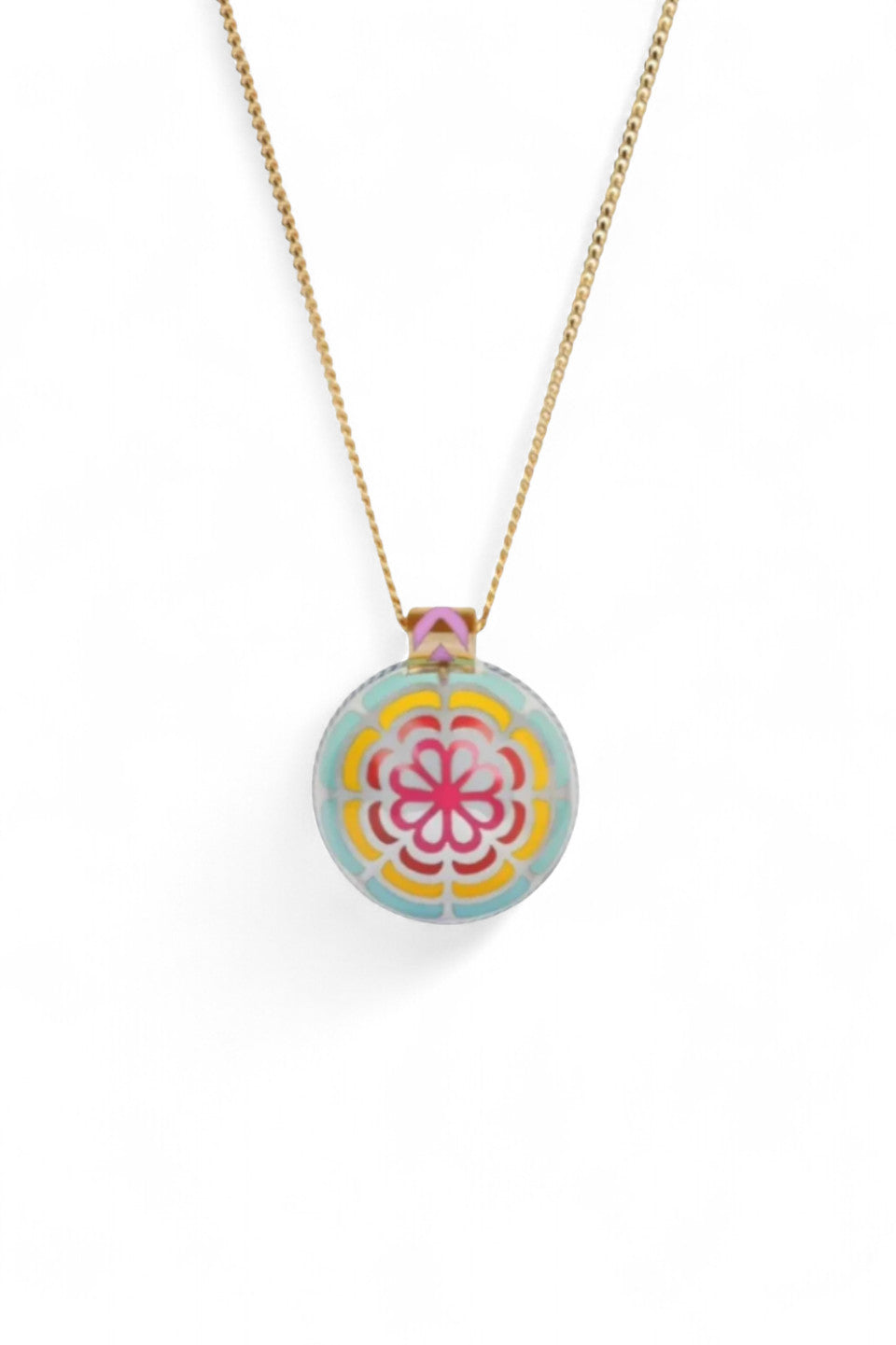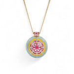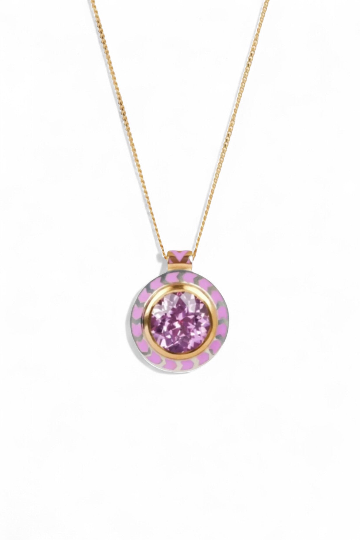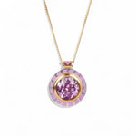 Alice Cicolini’s Silver Tile Mini Round Rainbow Pendant showcases her signature blend of vivid color and refined craftsmanship. The sterling silver pendant is decorated with lacquer enamel and centered with a brilliant lab-grown pink sapphire set in 22ct gold, suspended from an 18ct yellow gold chain with a 14ct gold bail. Inspired by the vibrant tilework of Uzbekistan’s temples, this piece brings a modern, neon-bright pop of color to any jewelry collection.