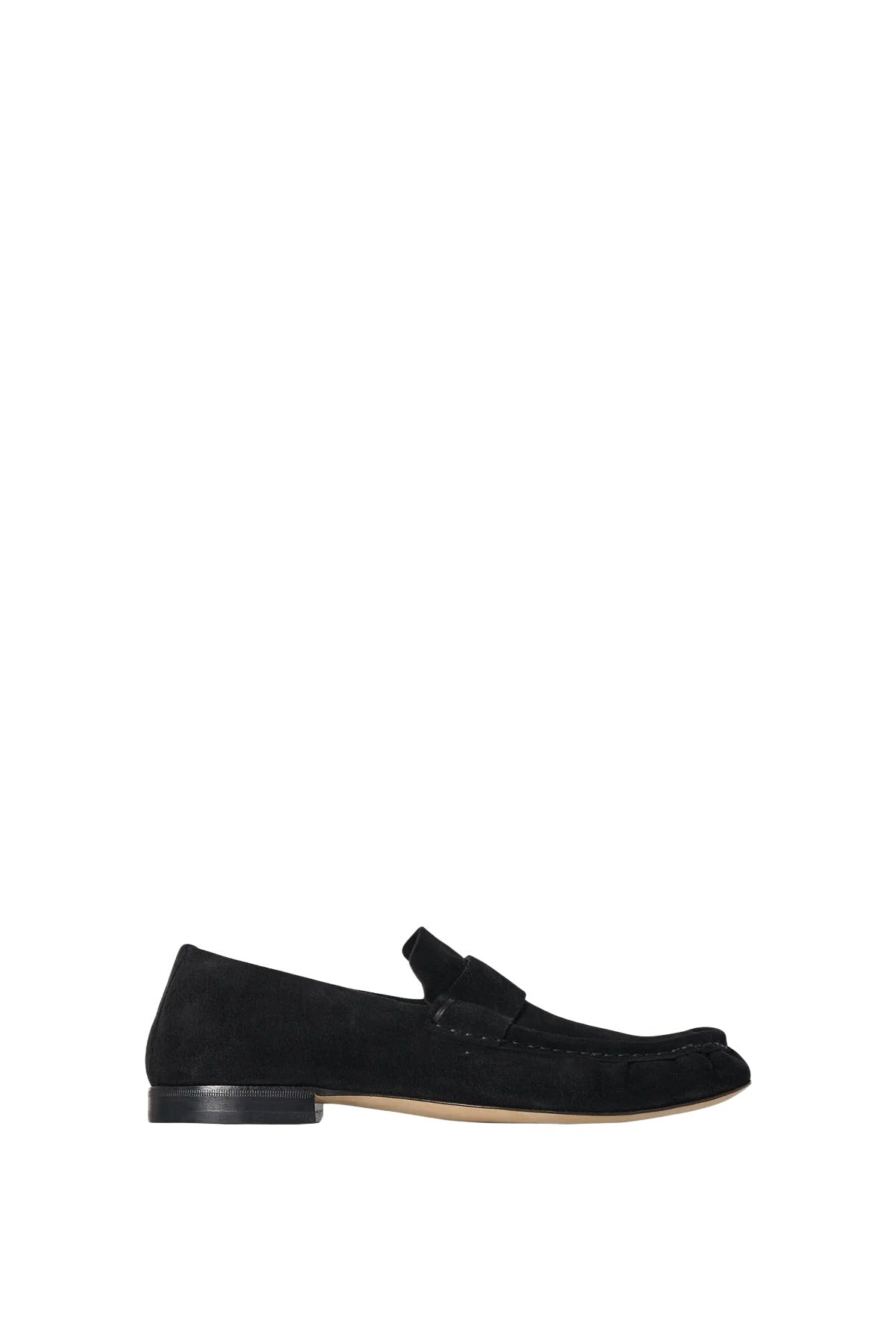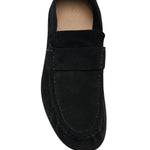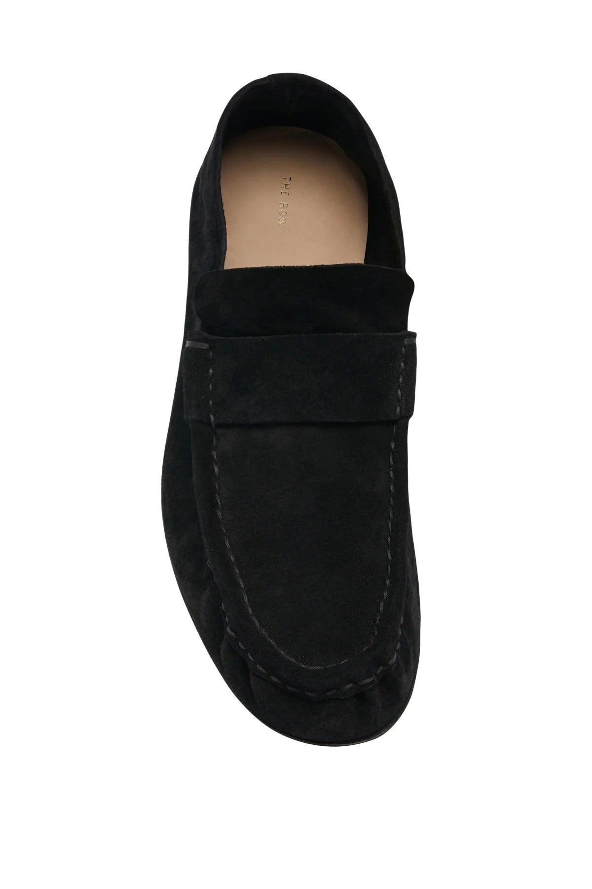 The Row soft mocassins are part of the Summer 25 Collection. A lightweight moccasin in soft calfskin suede with oval toe, stitched strap, and stacked heel.