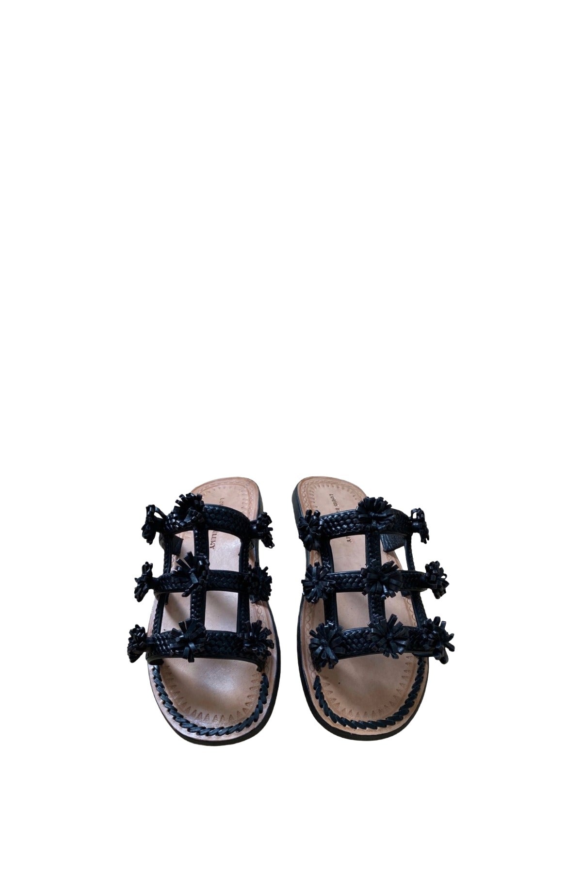 INFO Hand-braided flat leather cage sandals adorned with hand-cut palm tree shaped tassels made of leather adding a playful and authentic touch.