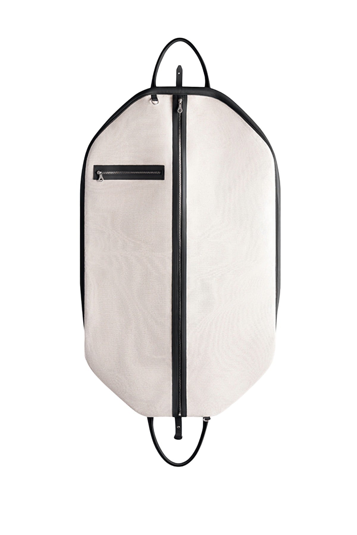 Canvas garment bag with leather trim, external compartment, and adjustable shoulder strap.