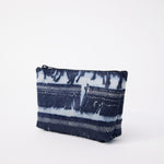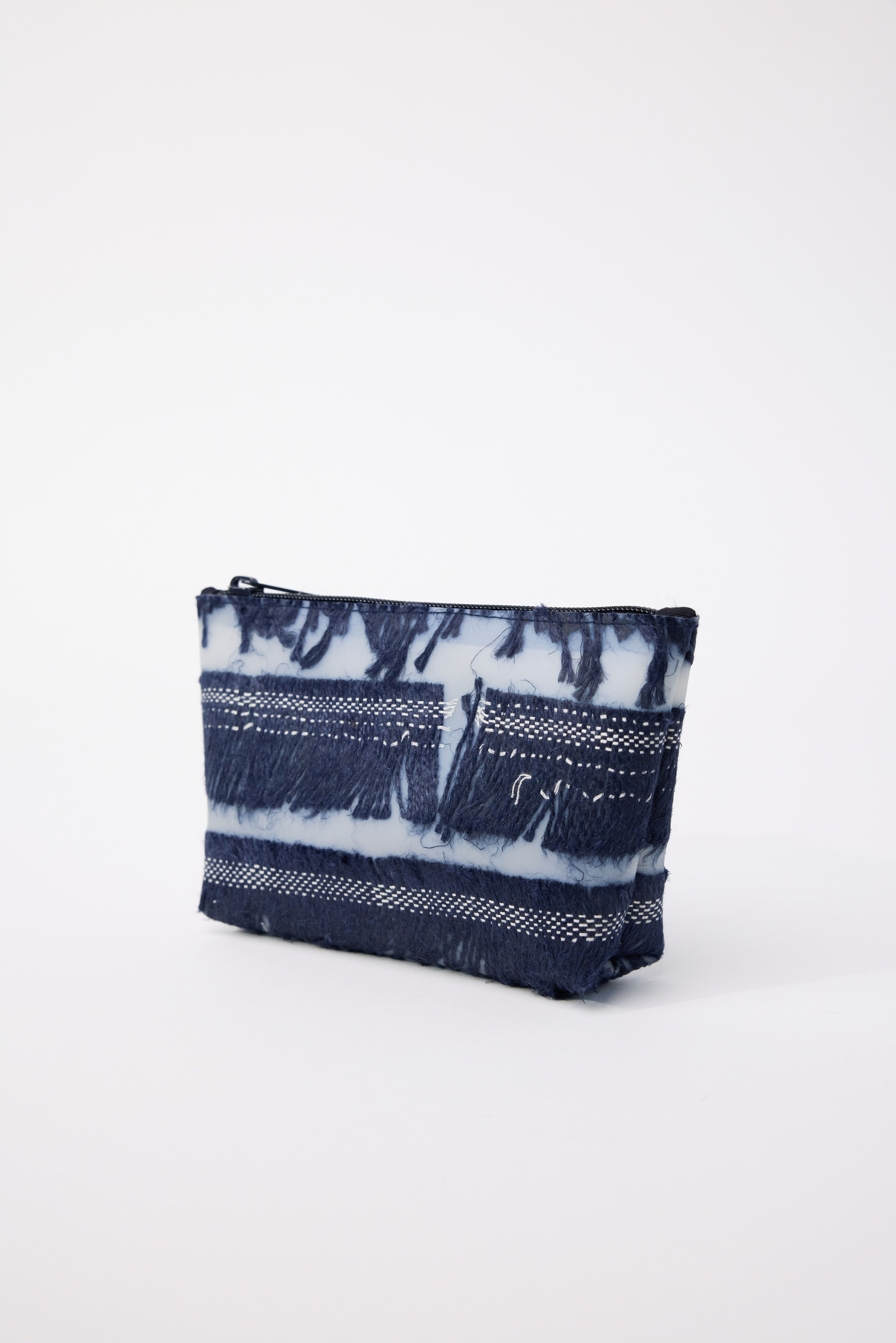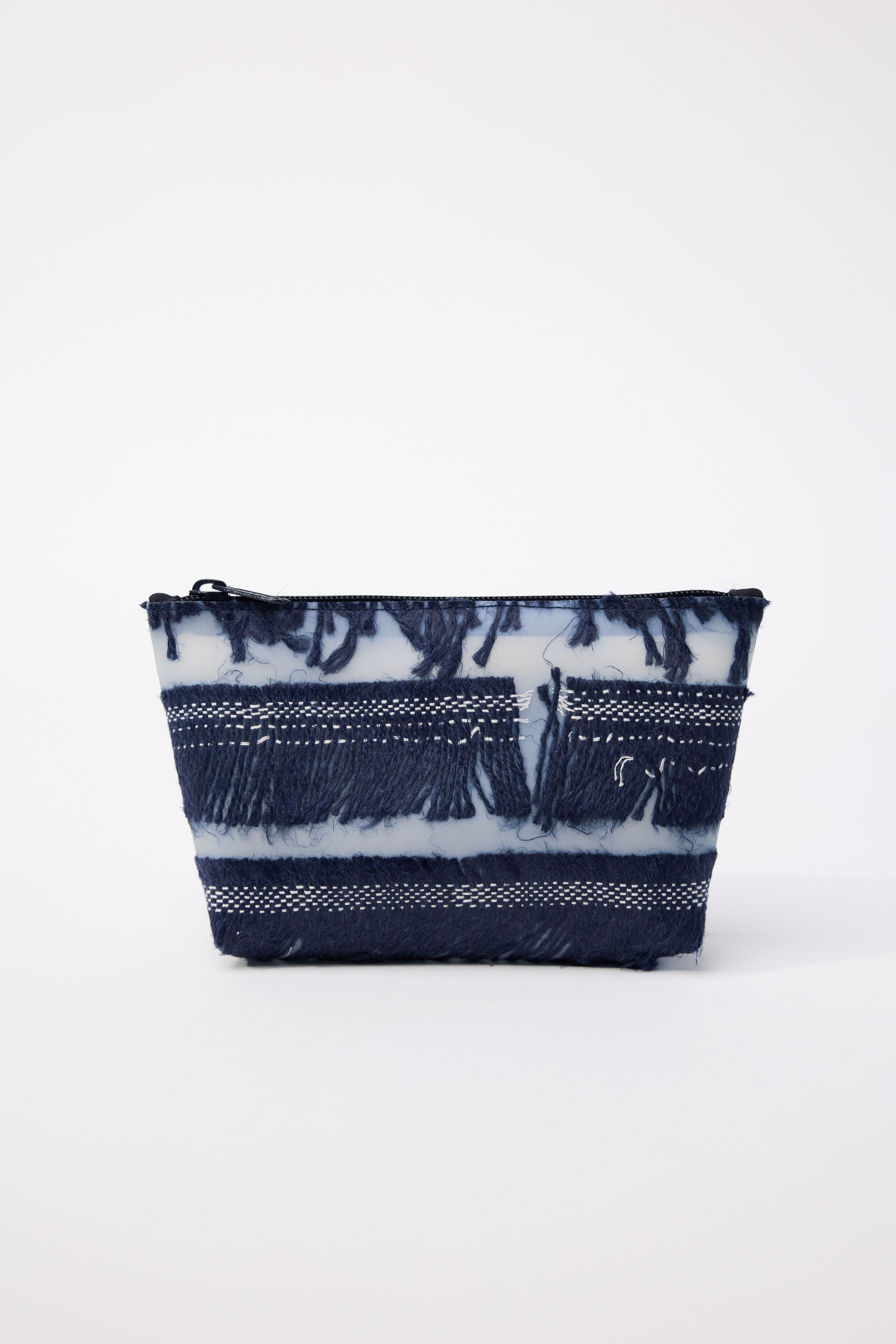 INFO VS Cosmetic Bag in Blue. This collection is made from an innovative and original material called II (eleven), which recycles textile scraps into polyurethane. Each piece is unique. II (Eleven) is the result of two elements perceived as opposite and contradictory: I: the textile element, warm, precious, soft + I: the plastic element, cold, rigid, cheap = II: as not the sum of the two but a third element, more then the two together. |