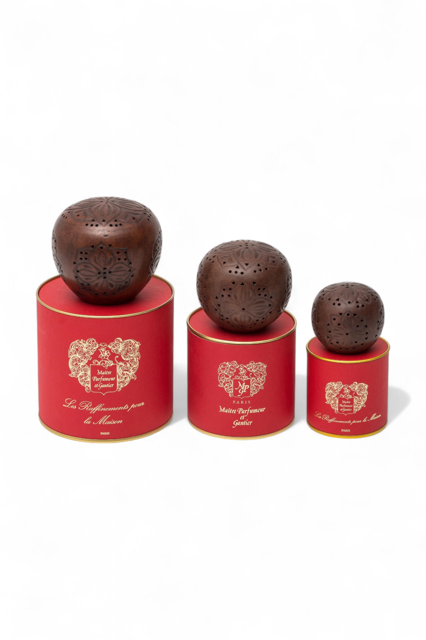 A signature object of the maison, the Pomme d’Ambre is a handcrafted terracotta sphere designed to perfume a space with quiet elegance. Infused with MPG’s warm, sweet blend of amber, balsams, vanilla, and tree moss, it releases its fragrance slowly and naturally over several months.