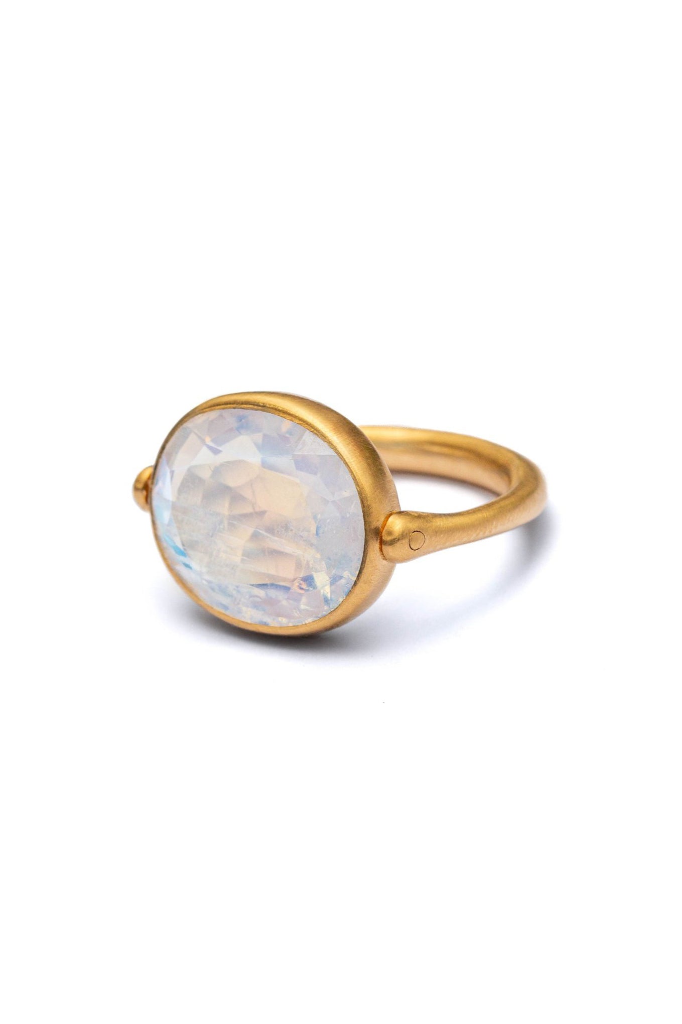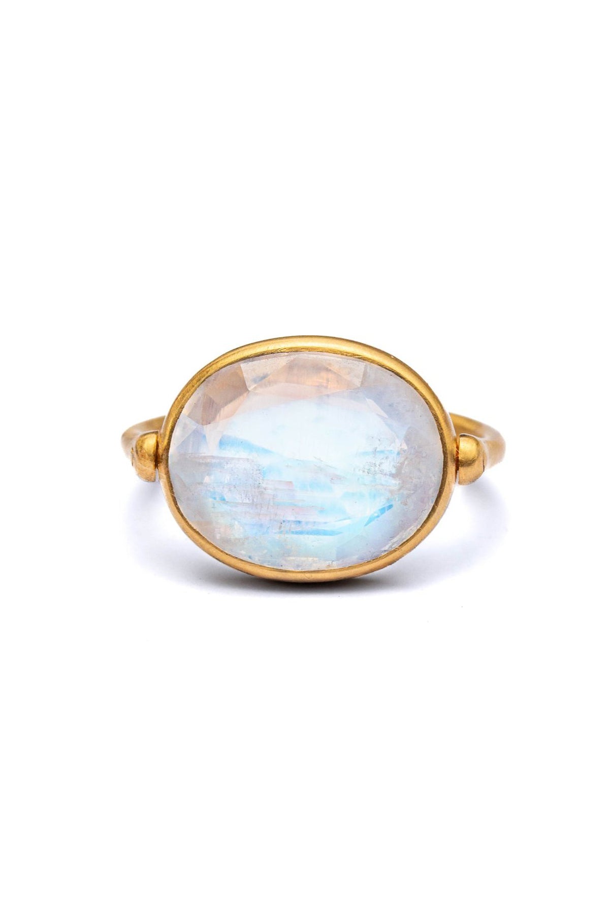 The oval rainbow moonstone is set in a smooth 22K yellow gold bezel that enhances its magical play of color. A timeless ring that feels both ancient and modern, perfect worn alone or layered with other MHT favorites.
