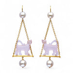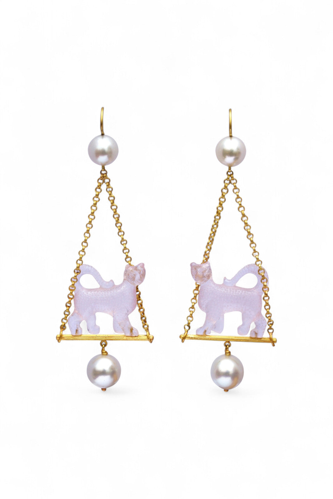 Marie-Hélène de Taillac's 'Renaissance 'Renaissance Cat' earrings feature a carved rose quartz cat resting on a golden swing with pearl accents. Rose Quartz: 31.76cts Pearl: 23.08cts |