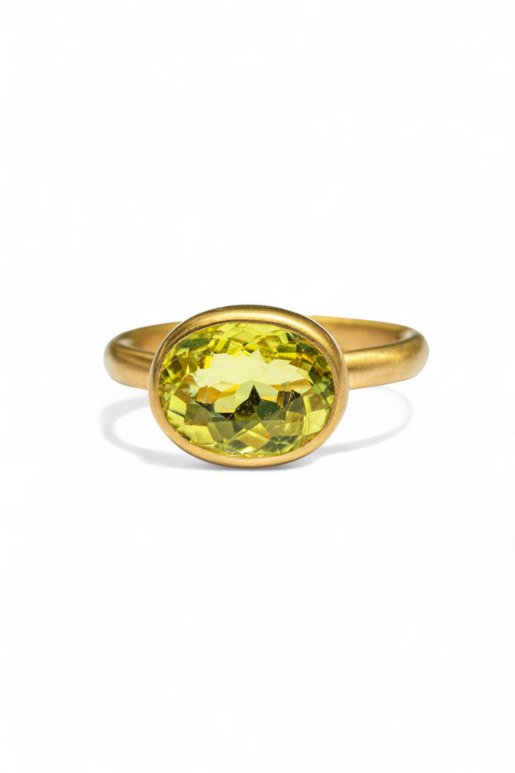 A luminous statement in sunshine yellow, the Yellow Tourmaline Princess Ring by Marie-Hélène de Taillac showcases a vibrant oval tourmaline in a warm 22K yellow gold bezel. The smooth, matte-finished gold amplifies the gemstone's radiant sparkle, making this an elegant everyday treasure or stacking favorite.
