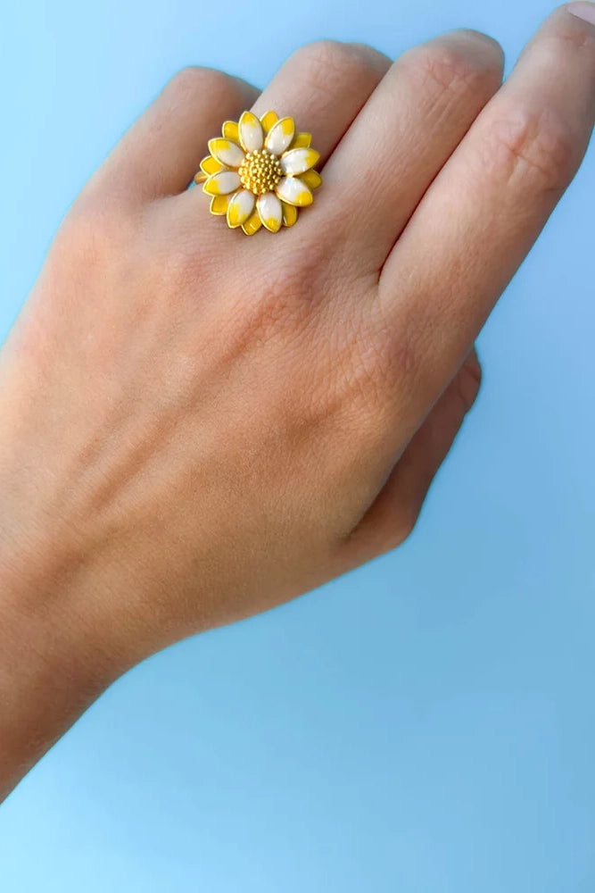 A joyful bloom that never fades. Marie-Hélène de Taillac captures sunshine and playfulness in this enamel sunflower ring, crafted petal by petal in radiant shades of pink and yellow. A cluster of golden beads forms the center of the flower, creating a charming, dimensional texture. Bold yet easy to wear, it brings a touch of light to every moment.