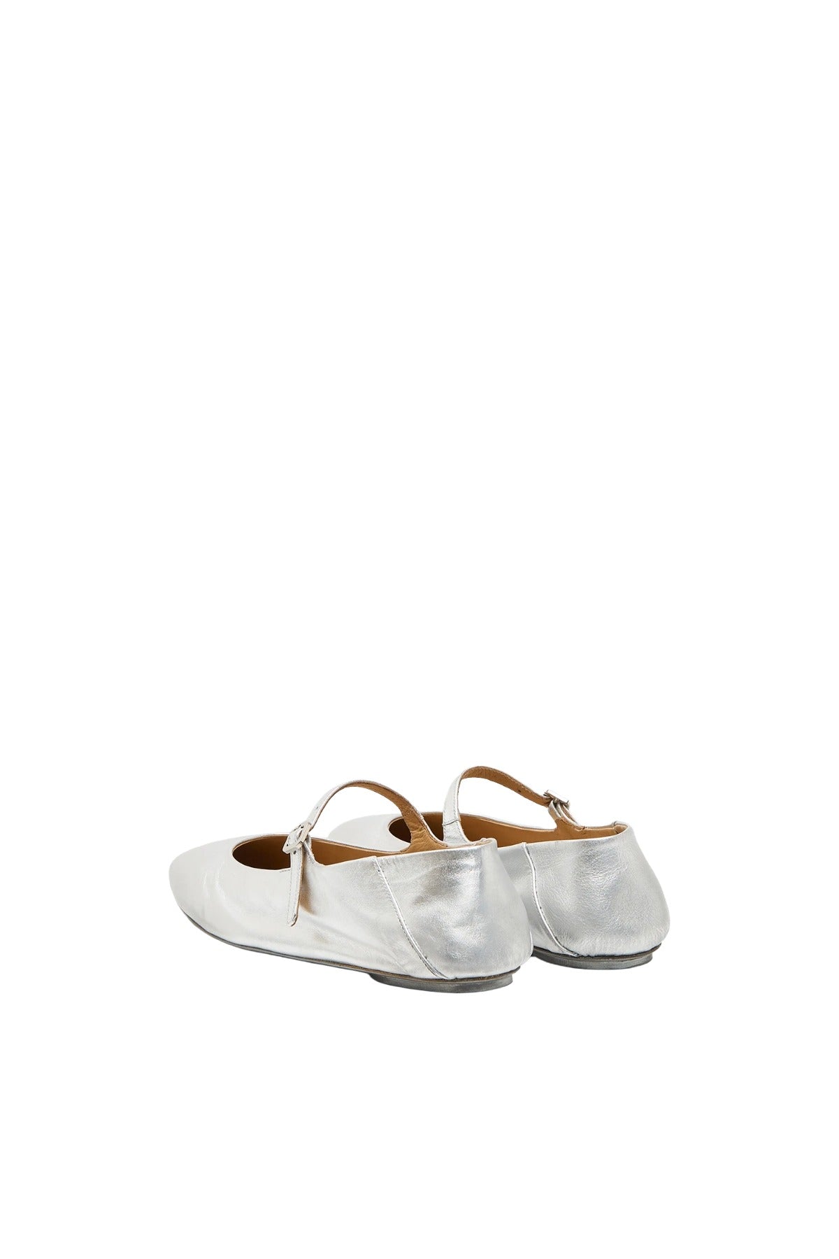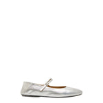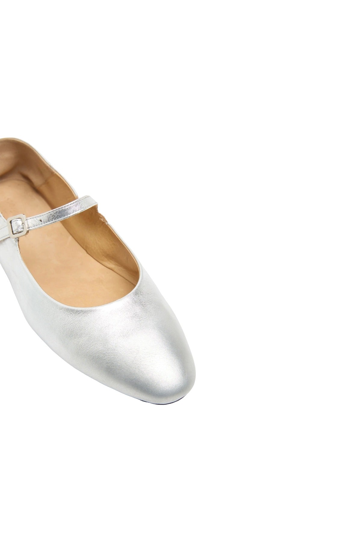 INFO Strascico Ballerina in soft laminated leather in the color silver foil. Inspired by dance shoes, this refined ballerina style features a delicately rounded and tapered toe. The thin strap, the small buckle and the choice of a very soft leather make it an extremely feminine and comfortable shoe.