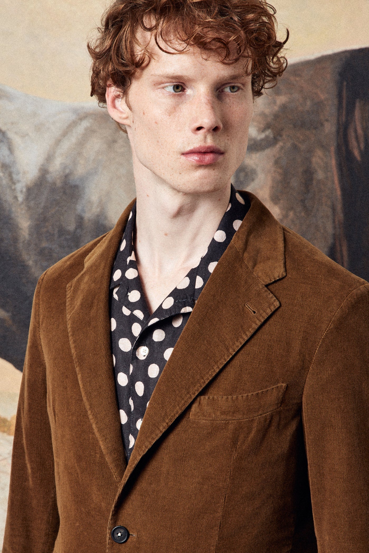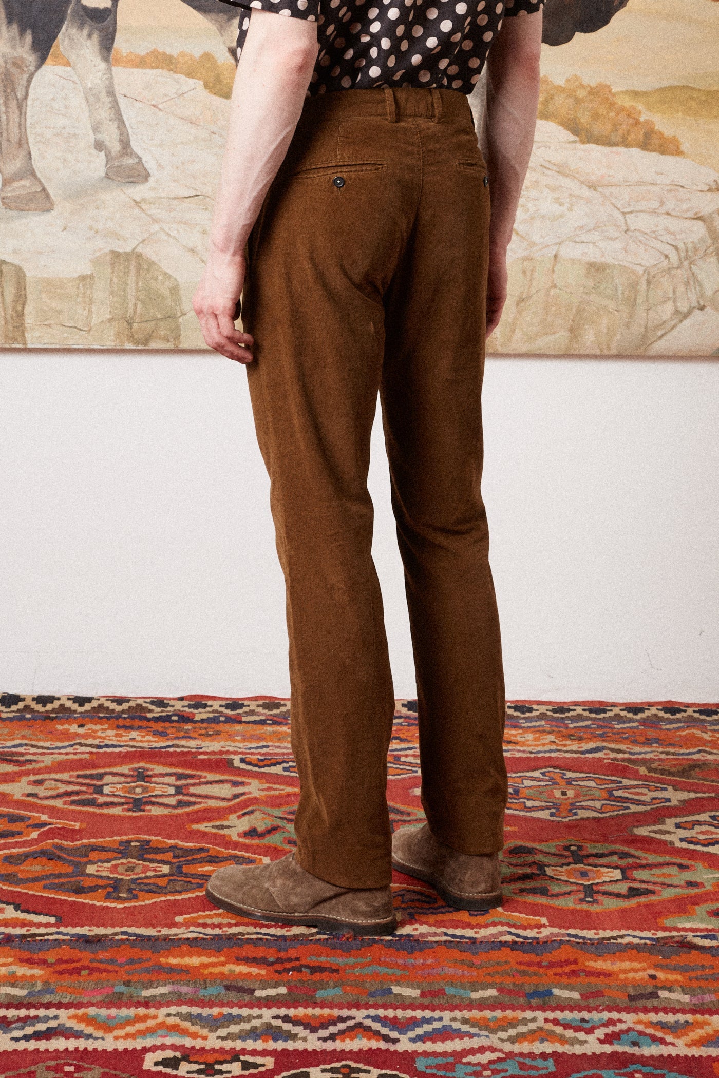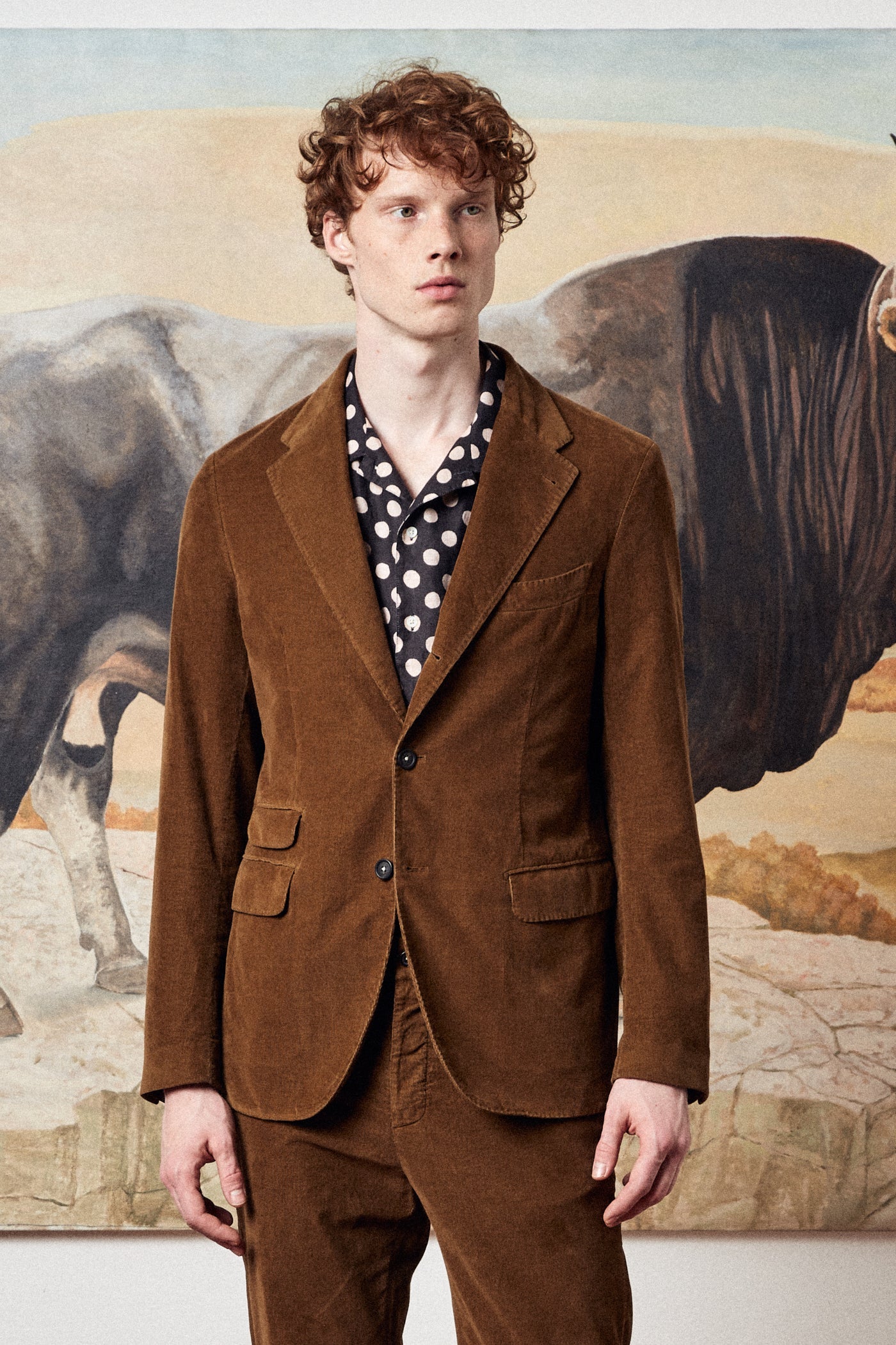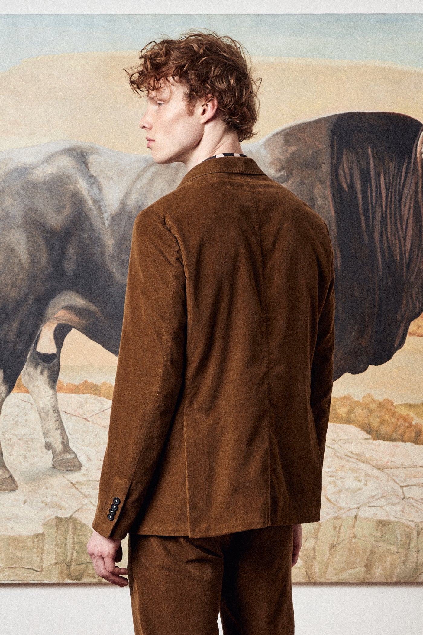 INFO Casual, deconstructed suit with a three-button, regular-fit jacket in cotton needlecord, featuring classic lapels with top-stitched detailing, flap pockets, dark horn buttons, a double vent on the back, and flat-front slim-fit trousers with a straight leg |