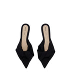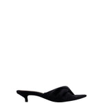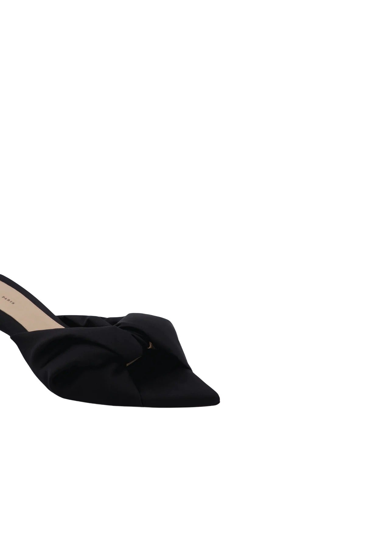 INFO Coupole open-toe shoe in deep black matt satin. The shoe features a padded, twisted upper and a 50s kitten heel. |