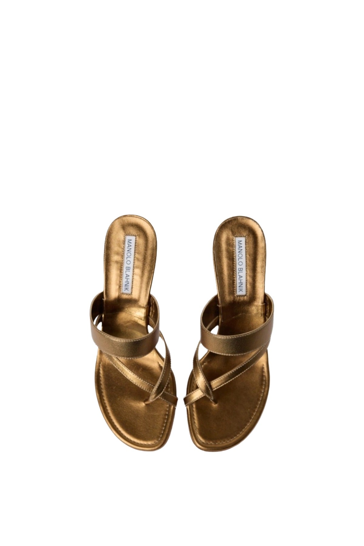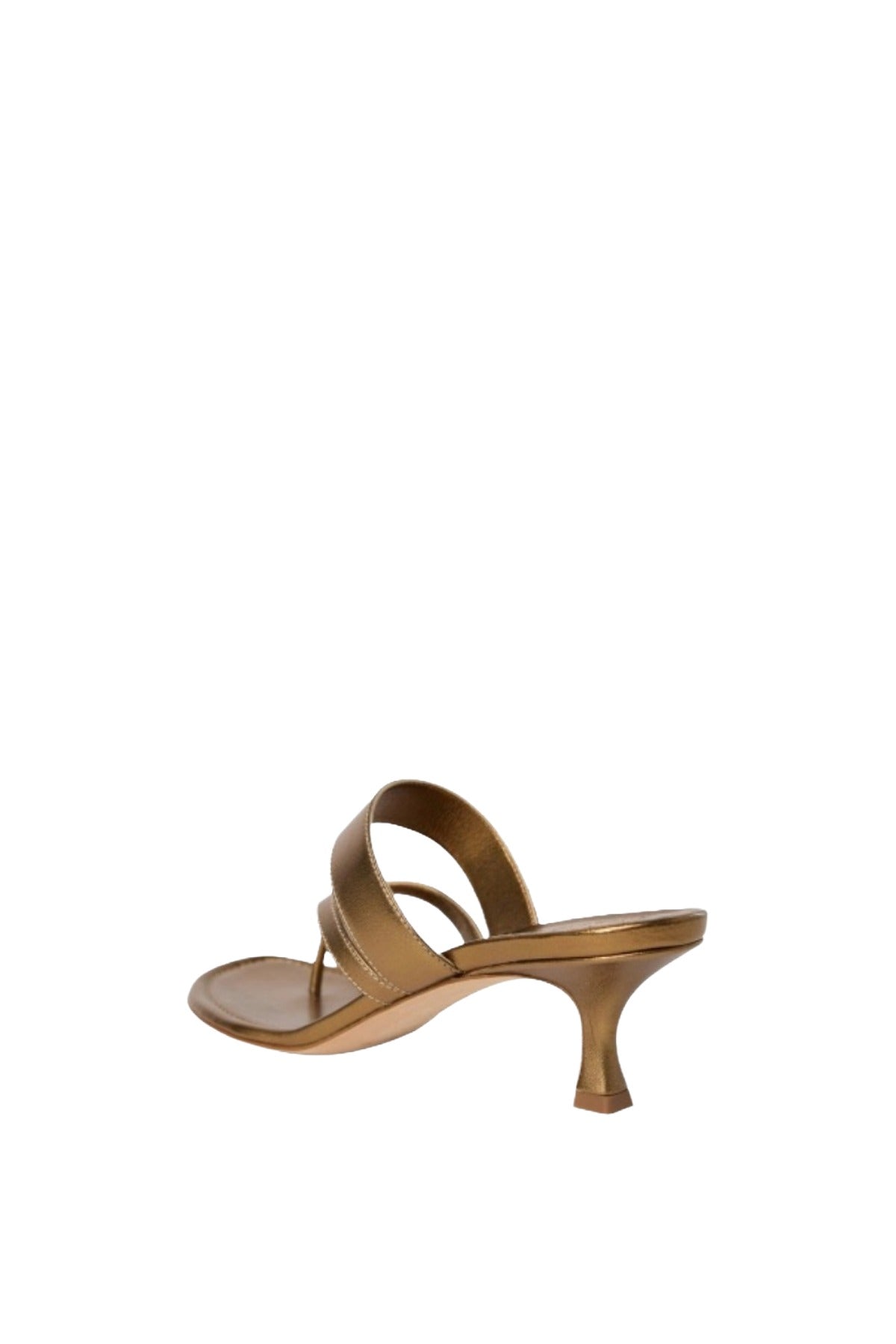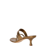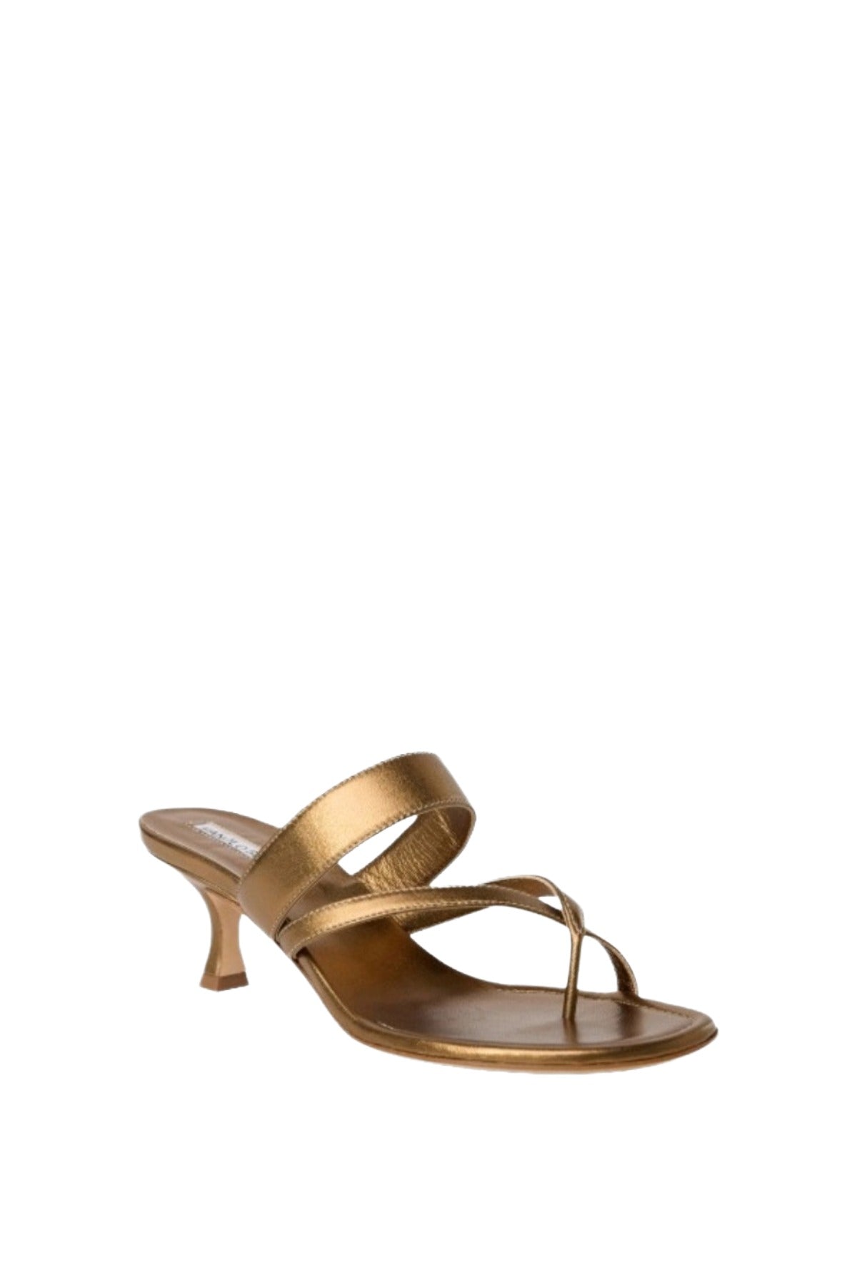 INFO Nappa leather open toe mules featuring crossover straps with toe stem and low mid heel. |