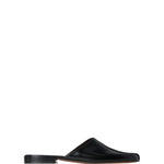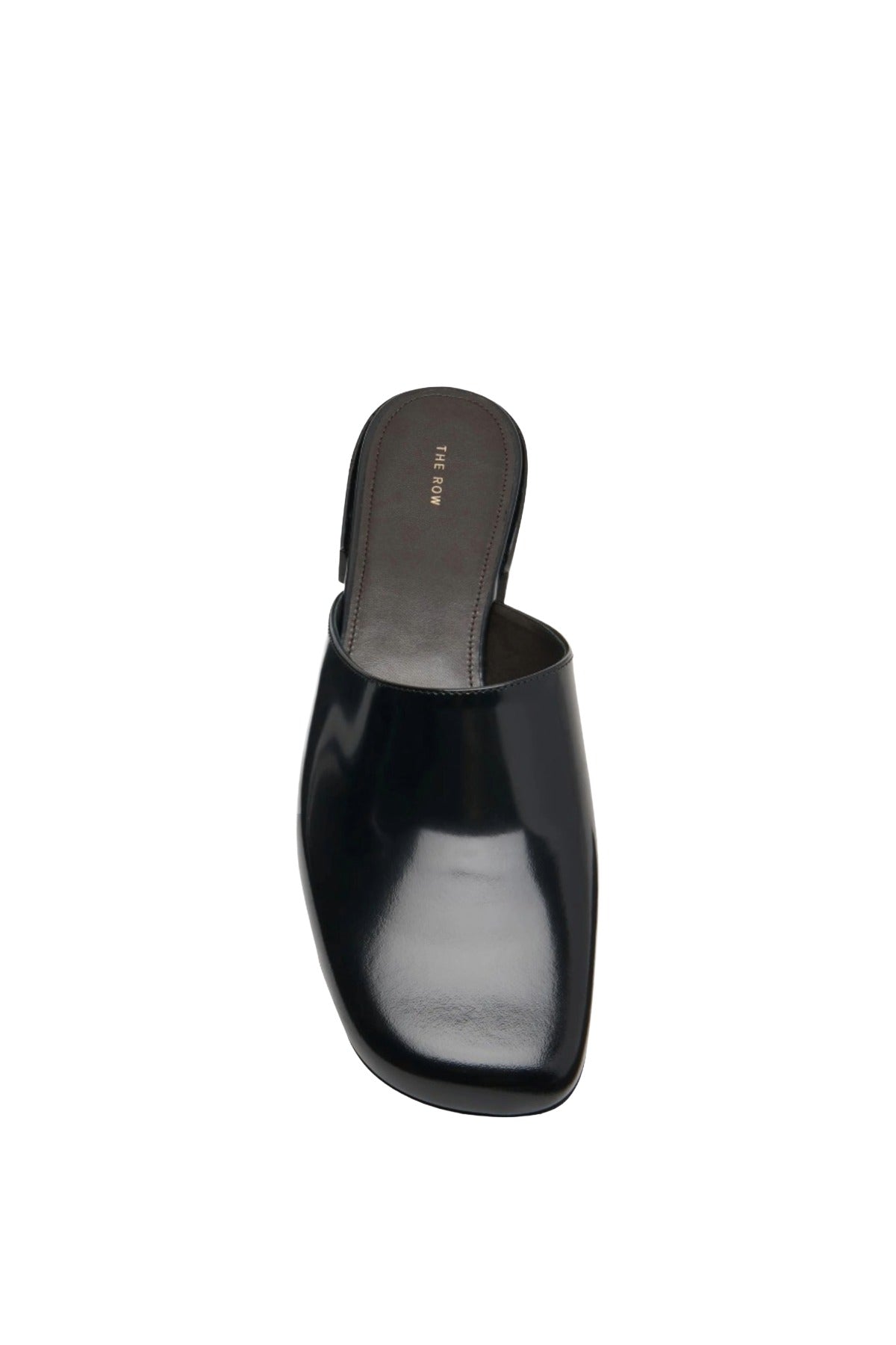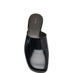 The Row Penelope Mule is part of the Fall 25 Collection. Streamlined slip-on shoe in glossy patent leather with square toe, stacked heel, and rubber sole.