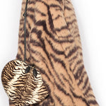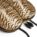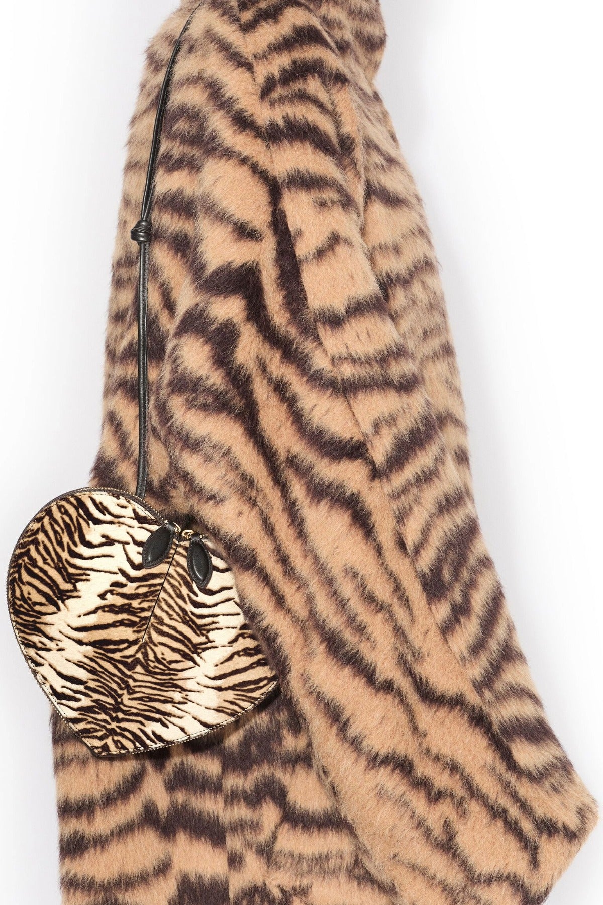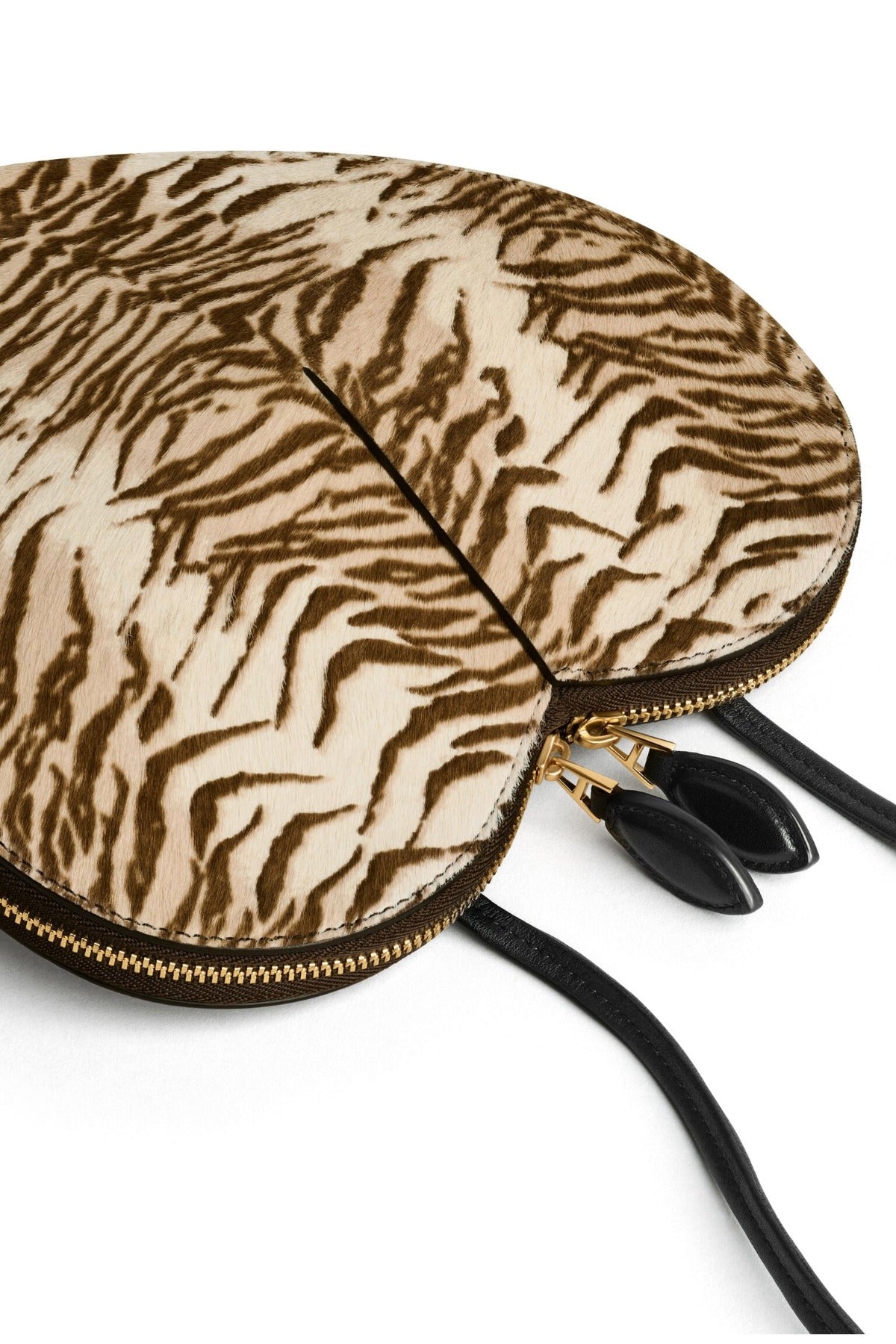 Alaia Le Coeur Bag in Haircalf is part of the Winter Spring 26 Collection. Alaia's iconic Le Coeur bag reimagines the house's most recognizable silhouette in luxurious tiger-printed haircalf leather. The distinctive 3D heart shape serves as both a sculptural statement piece and a functional accessory, instantly elevating any ensemble with its bold geometric form. Crafted from premium haircalf, the bag showcases striking natural texture and pattern variation characteristic of this refined material. The secure zip closure protects your essentials while maintaining the design's clean aesthetic. An adjustable leather strap offers versatile styling options—wear it as a structured shoulder bag for polished occasions or adjust it for crossbody carry throughout your day. Measuring 21cm in length, 17cm in height, and 5cm in depth, the proportions strike an ideal balance between presence and practicality. Handcrafted in Italy, this piece exemplifies Alaia's commitment to exceptional construction and innovative design that transcends seasonal trends.