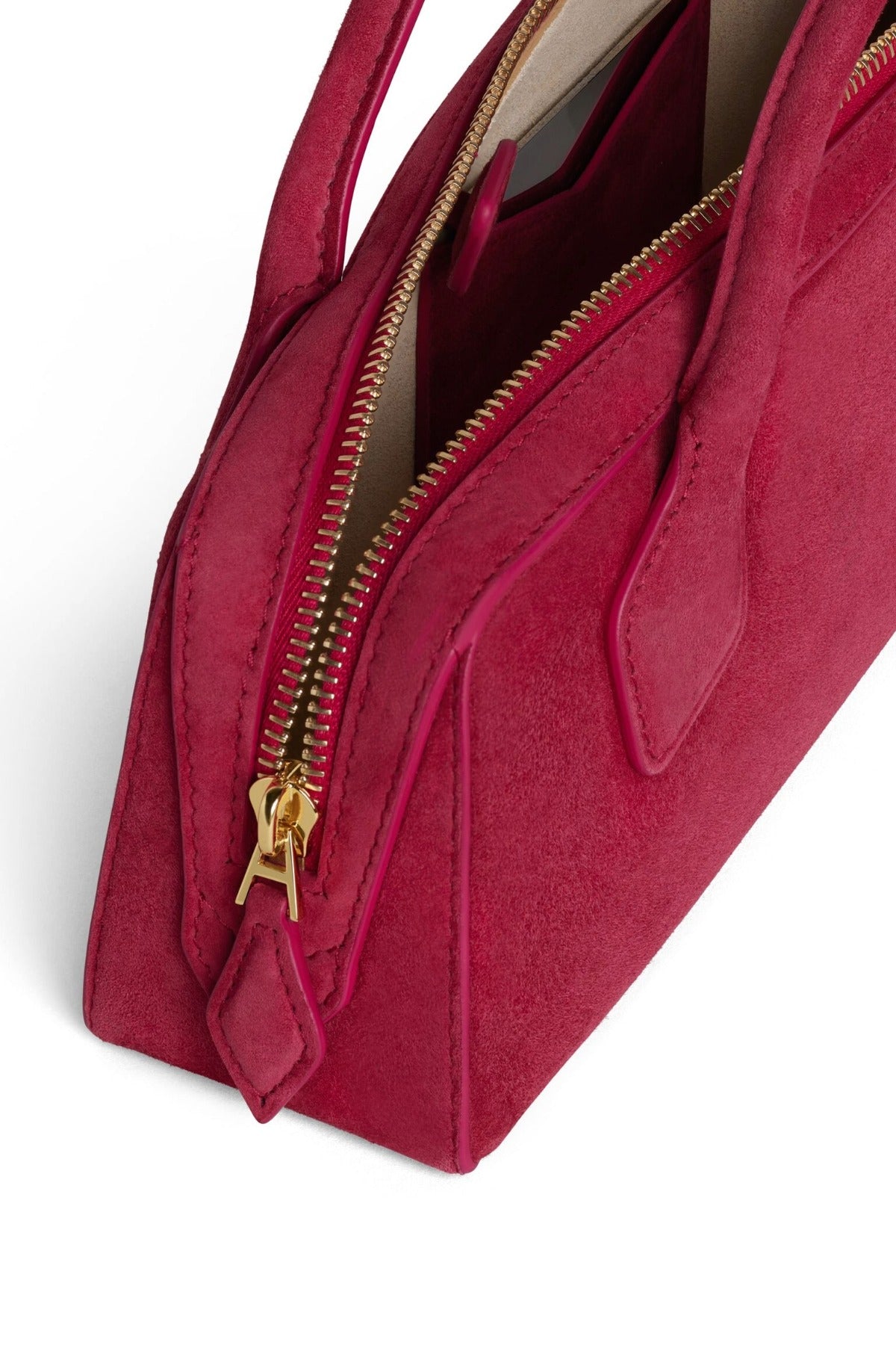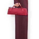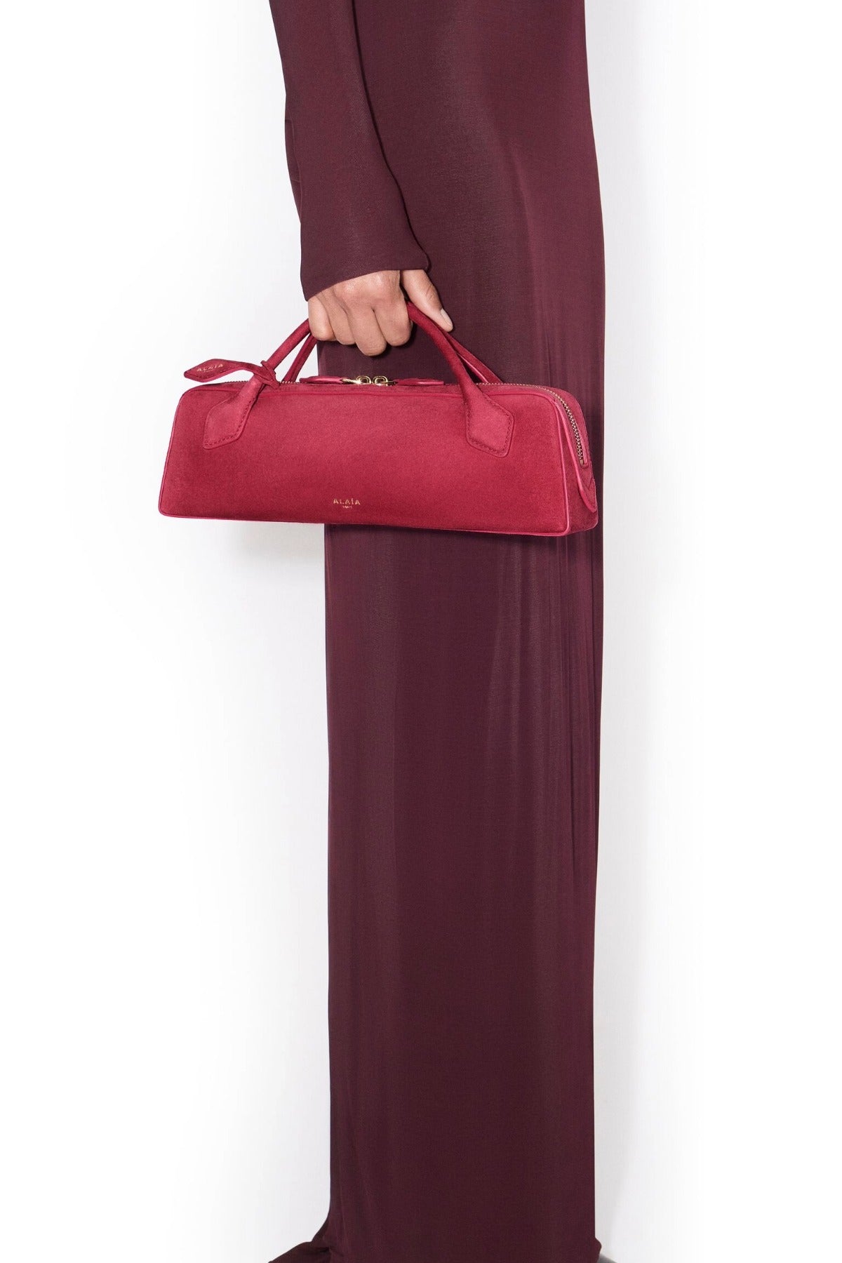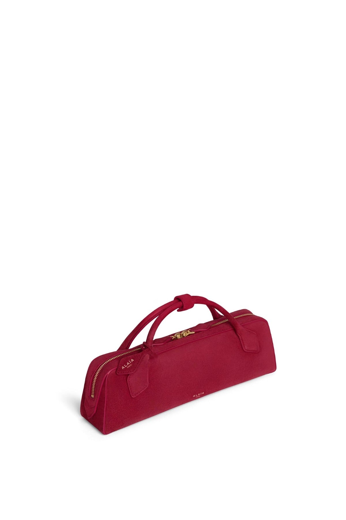 Alaia Le Teckel Clutch Bag in Suede is part of the Winter Spring 26 Collection. The Alaia Le Teckel Clutch Bag represents a refined interpretation of the house's iconic silhouette, translated into an elegant clutch format. This piece showcases the distinctive elongated proportions and tubular short handles adorned with decorative ties that define the Le Teckel aesthetic. The double zip closure ensures secure storage, while an interior pocket features a small removable mirror—a thoughtful detail for on-the-go convenience. Crafted from supple suede goatskin leather, the bag demonstrates the meticulous attention to material quality that characterizes Alaia's design philosophy. The tactile surface and natural patina of suede develop character with use, making each piece uniquely personal. Designed for hand carry, the proportions (31cm L x 10cm H x 7cm D) strike a balance between capacity and refined portability, suitable for evening occasions or sophisticated daytime wear. Proudly made in Italy, this clutch exemplifies the brand's commitment to European craftsmanship and timeless design principles.