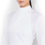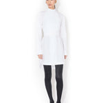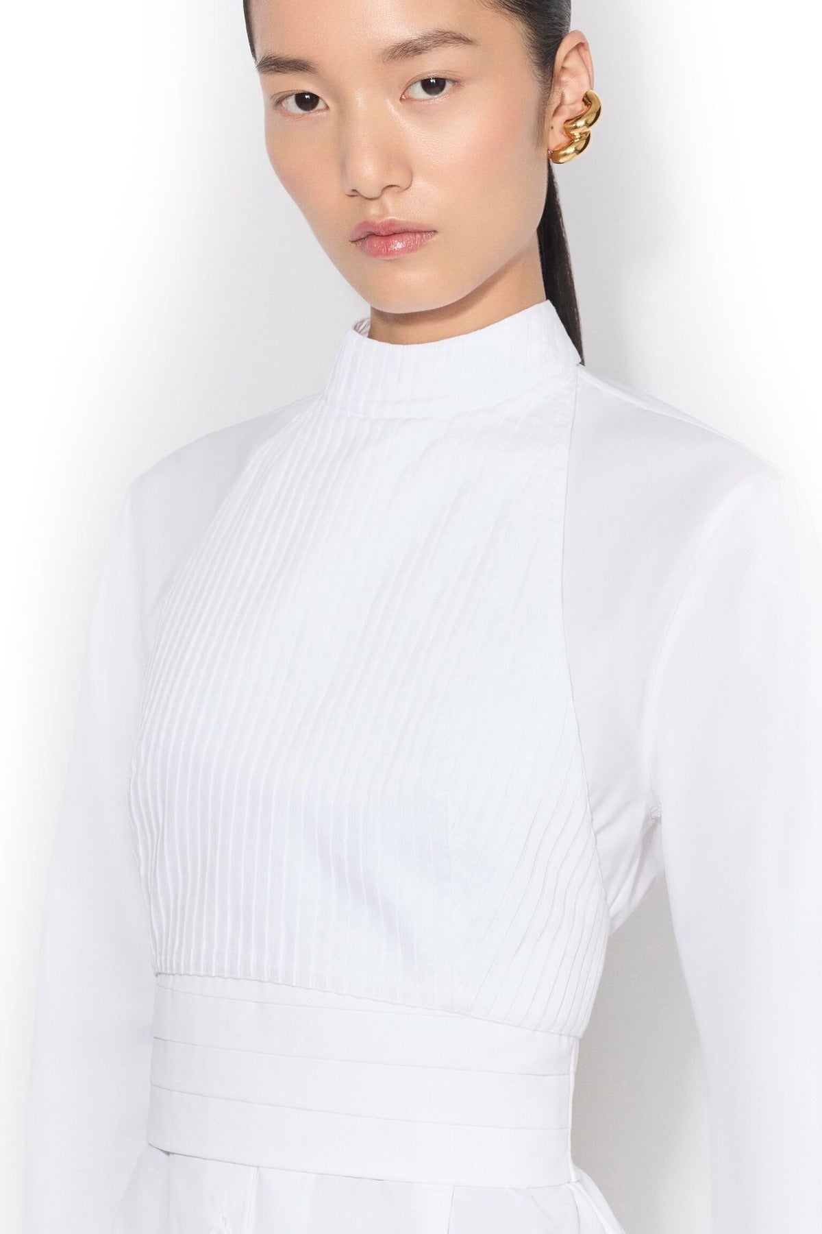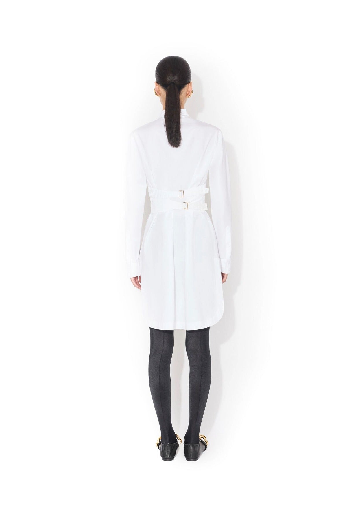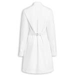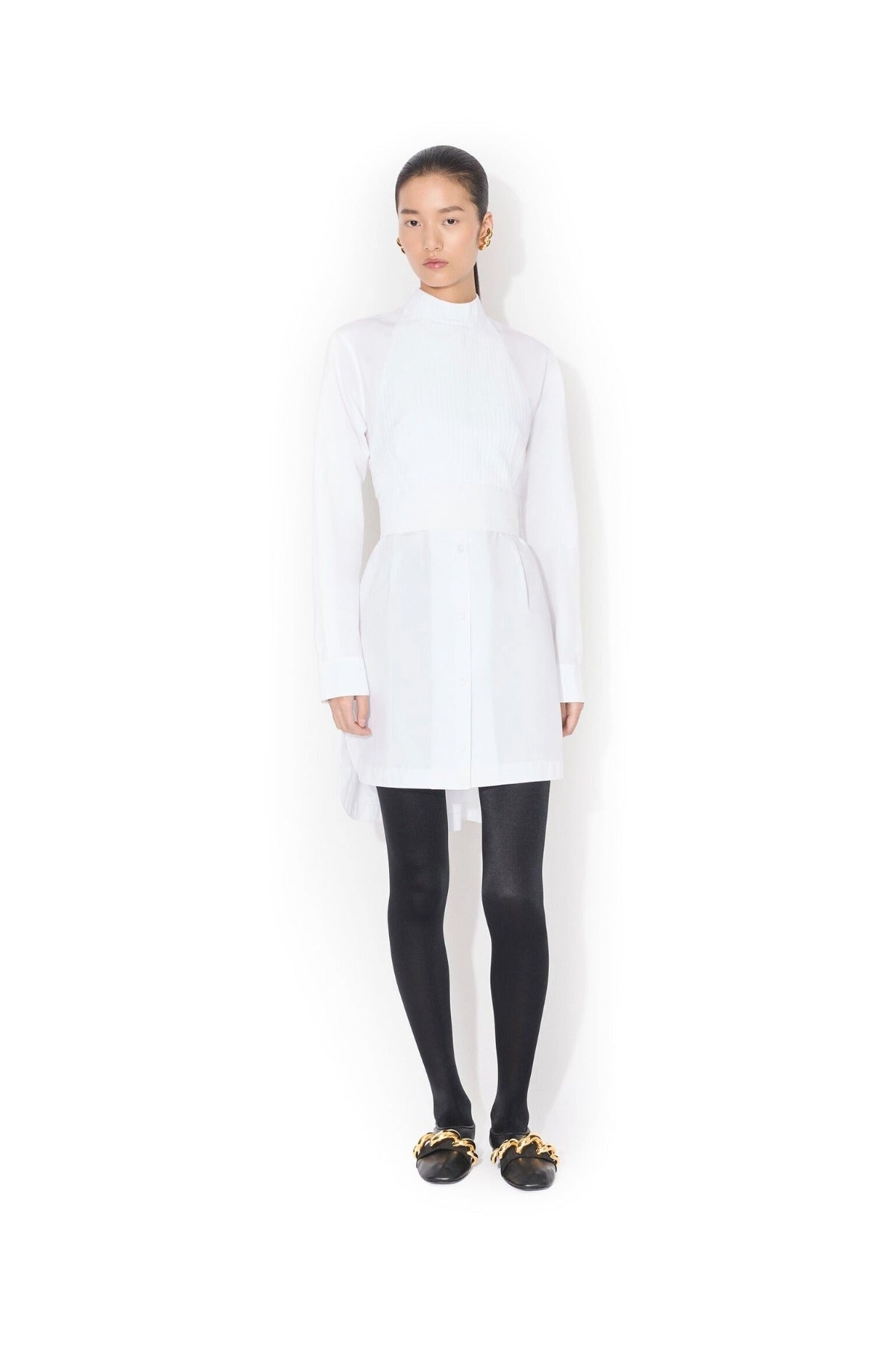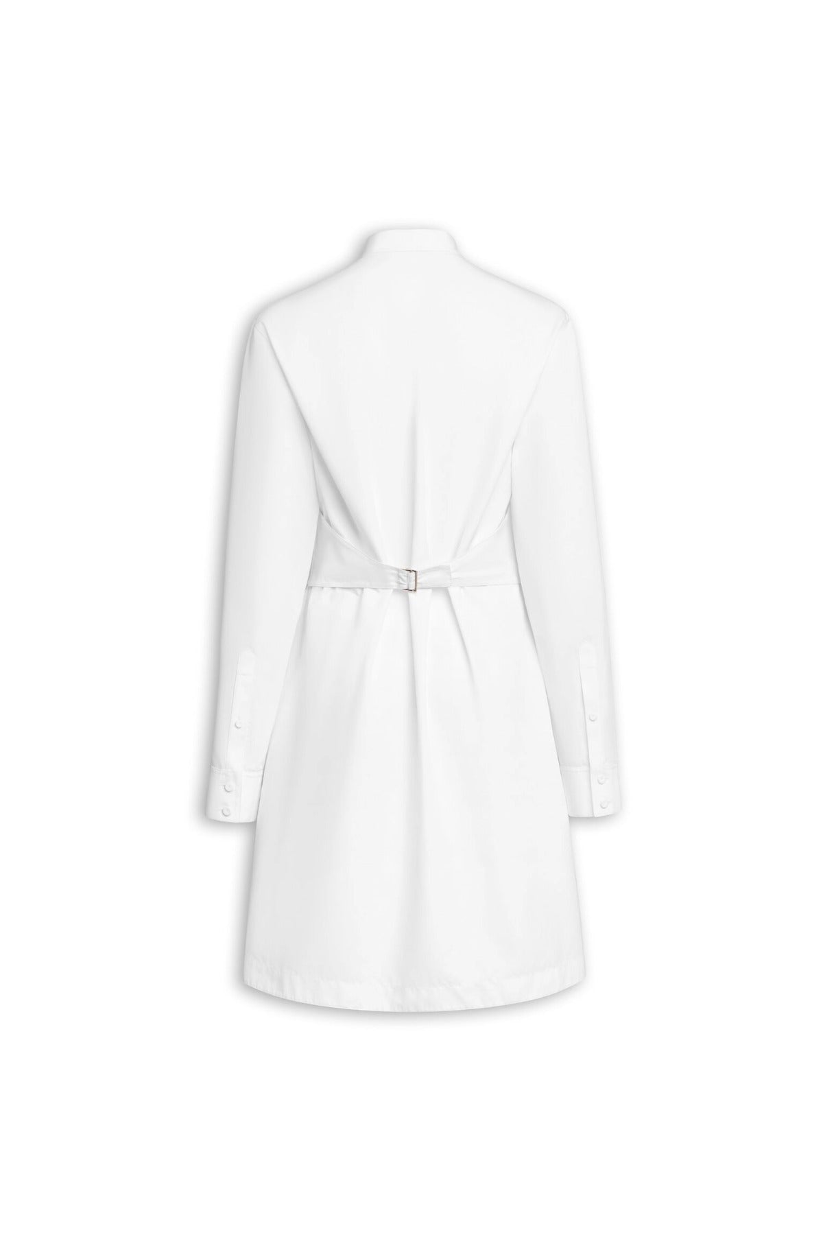Alaia Wrap Cotton Poplin Dress is part of the Winter Spring 26 Collection. The Alaia Wrap Cotton Poplin Dress exemplifies refined minimalist design with exceptional versatility. Crafted from crisp cotton poplin, this mini dress features a distinctive band collar and long sleeves finished with buttoned cuffs for polished sophistication. The cinched silhouette creates a flattering, defined waist that transitions seamlessly into an asymmetrical hemline. The standout feature is the removable pleated plastron, secured with elegant gold hardware and tied at the back, allowing you to customize the dress's aesthetic for different occasions. Wear it as a structured wrap dress or remove the plastron for a streamlined look—two distinct styles in one piece. The Italian craftsmanship ensures impeccable construction and attention to detail throughout. Perfect for those who appreciate architectural tailoring and investment pieces that transcend seasonal trends.