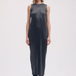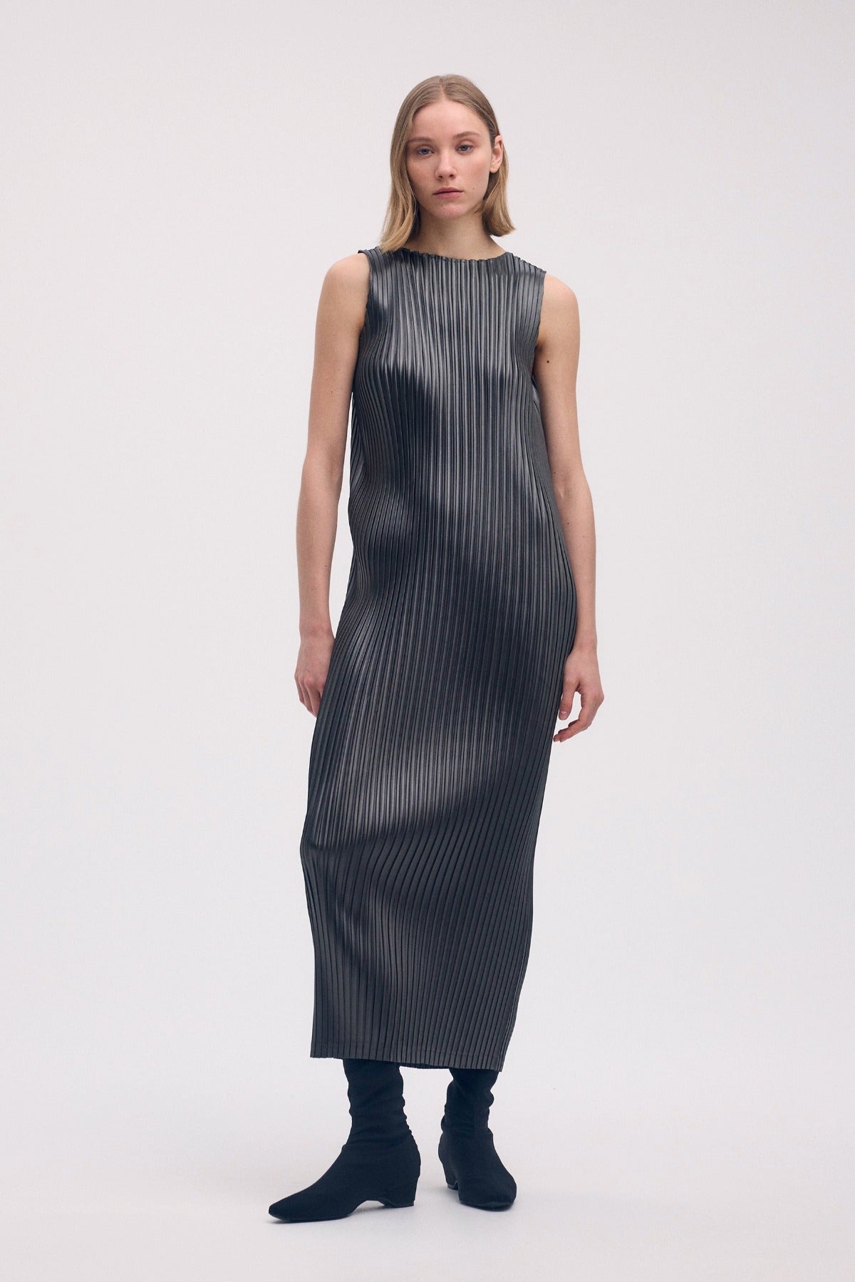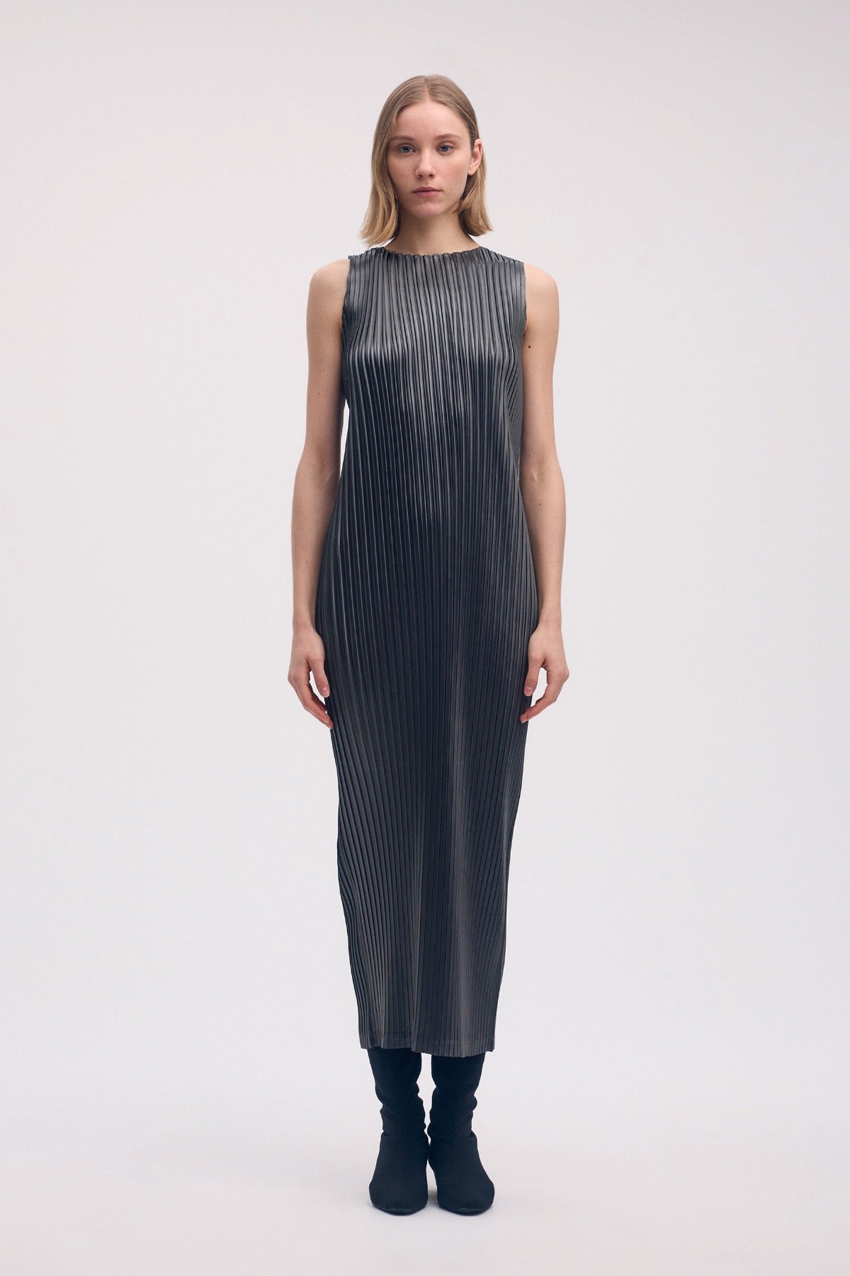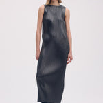 Issey Miyake Glossed Metal Pleats Dress is part of the Fall 25 Collection. This sleeveless dress is characterized by its texture that shines just like metal. After applying a vintage finish to polyester satin to create a soft texture and wrinkling, a calendering process is used to add luster to the fabric, resulting in a unique shine and depth. Designed with a slim silhouette, the dress lets you simply enjoy the unique feel of the material.