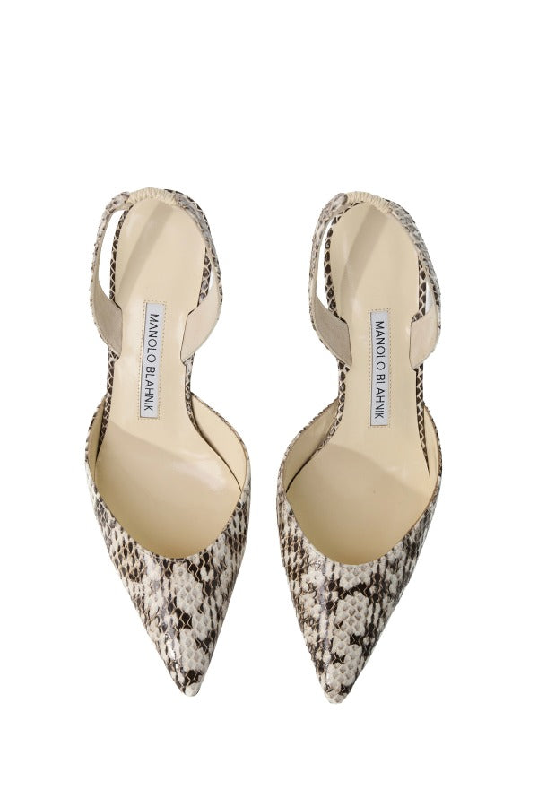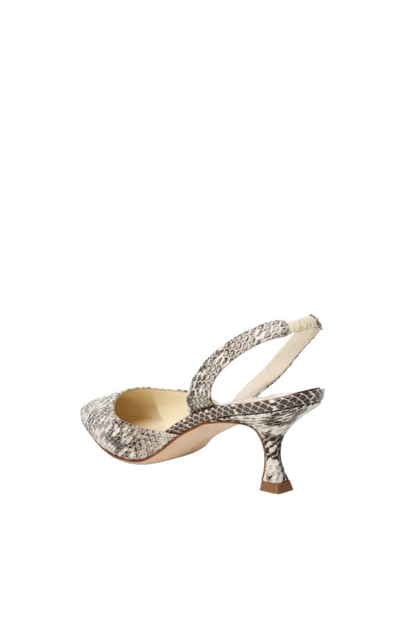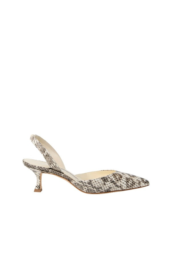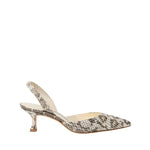 INFO Snake skin and leather slingback pumps featuring a pointed toe and self covered heel. |