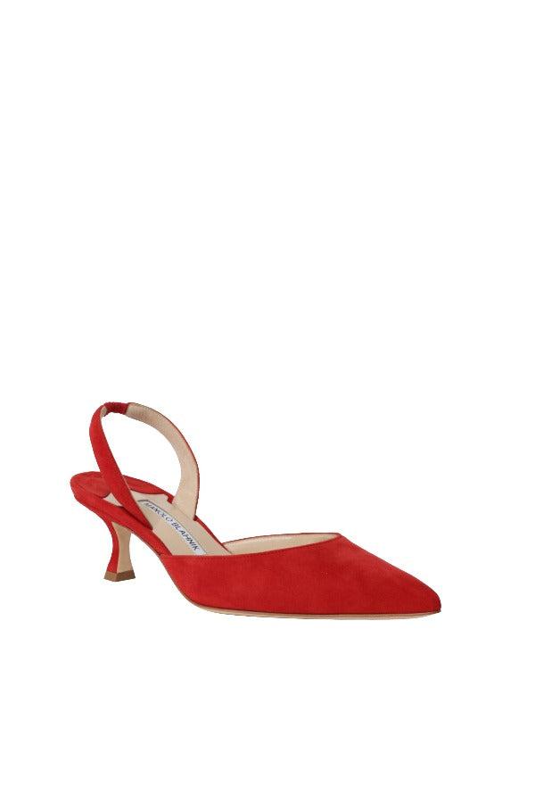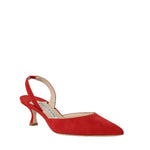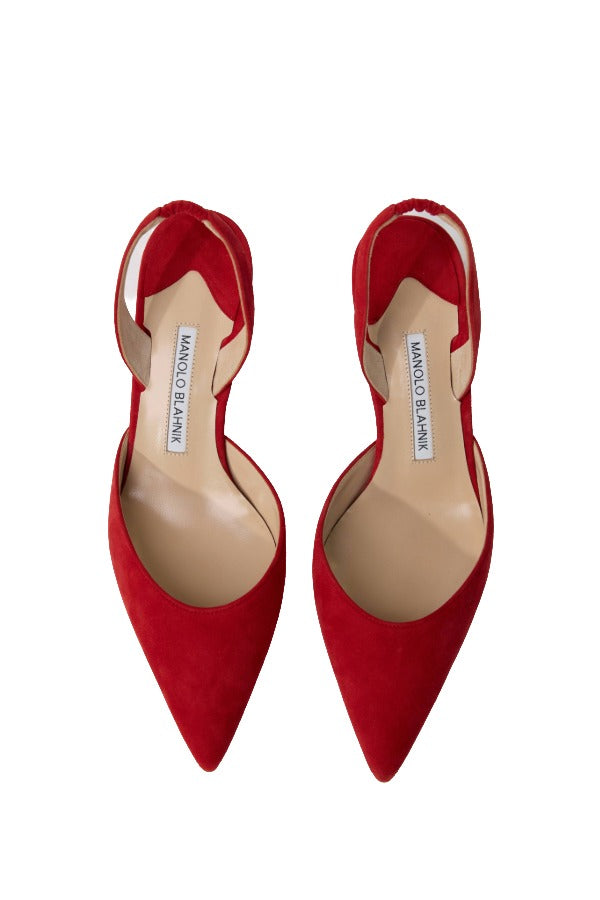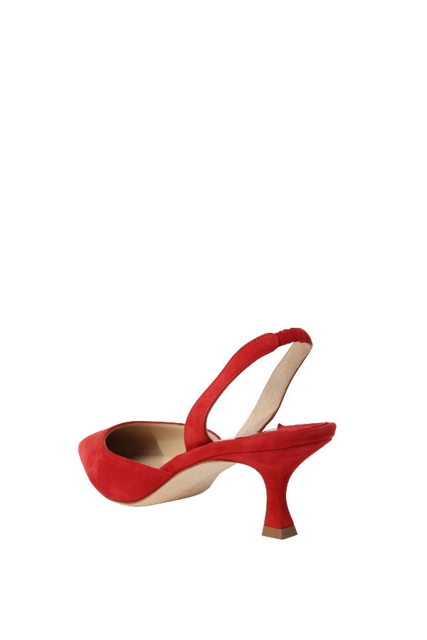 INFO Red suede slingback pumps featuring an almond toe and stiletto kitten heel. |