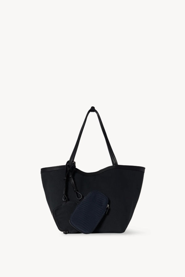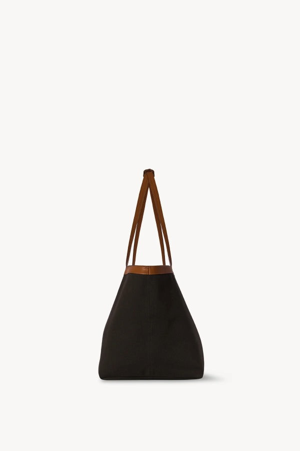 The Row Park Tote Three Canvas  is part of the Fall 25 Collection. Classic tote bag in textured cotton twill with interior toggle closure, saddle leather trim, and interior wristlet with adjustable strap.