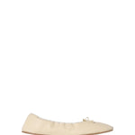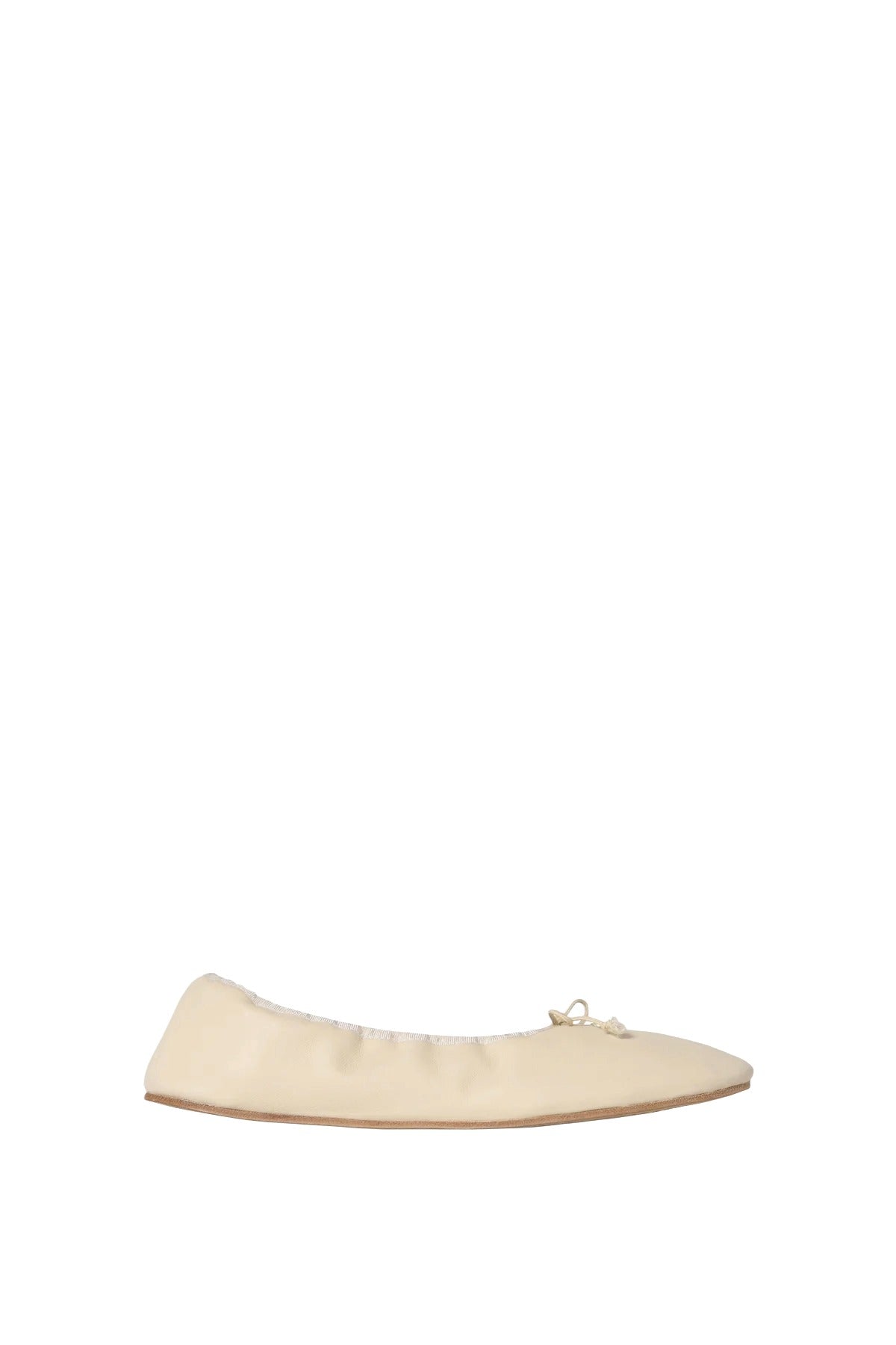 The Row's round ballet flats are a classic ballet flat in smooth nappa leather with grosgrain piping, adjustable elastic tie, and flexible leather sole.