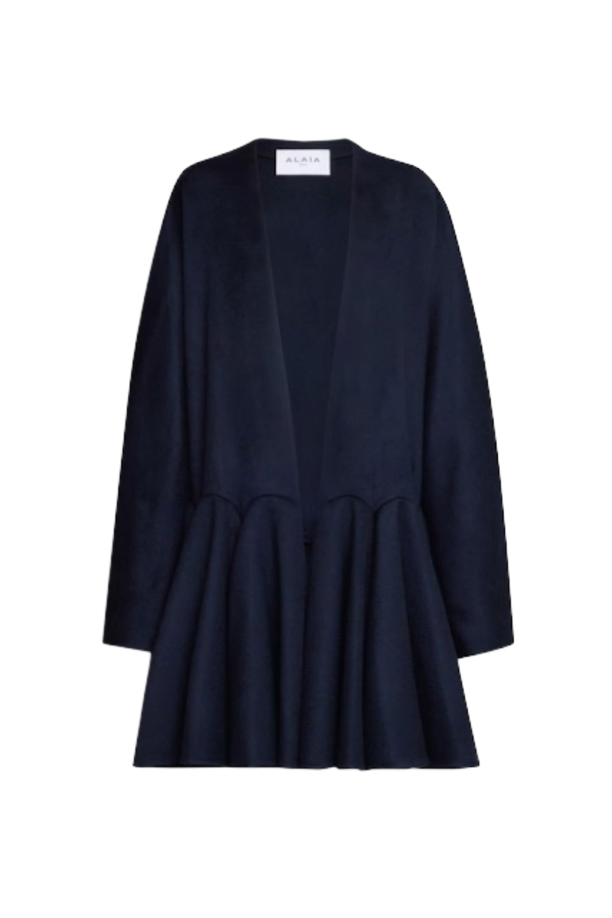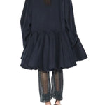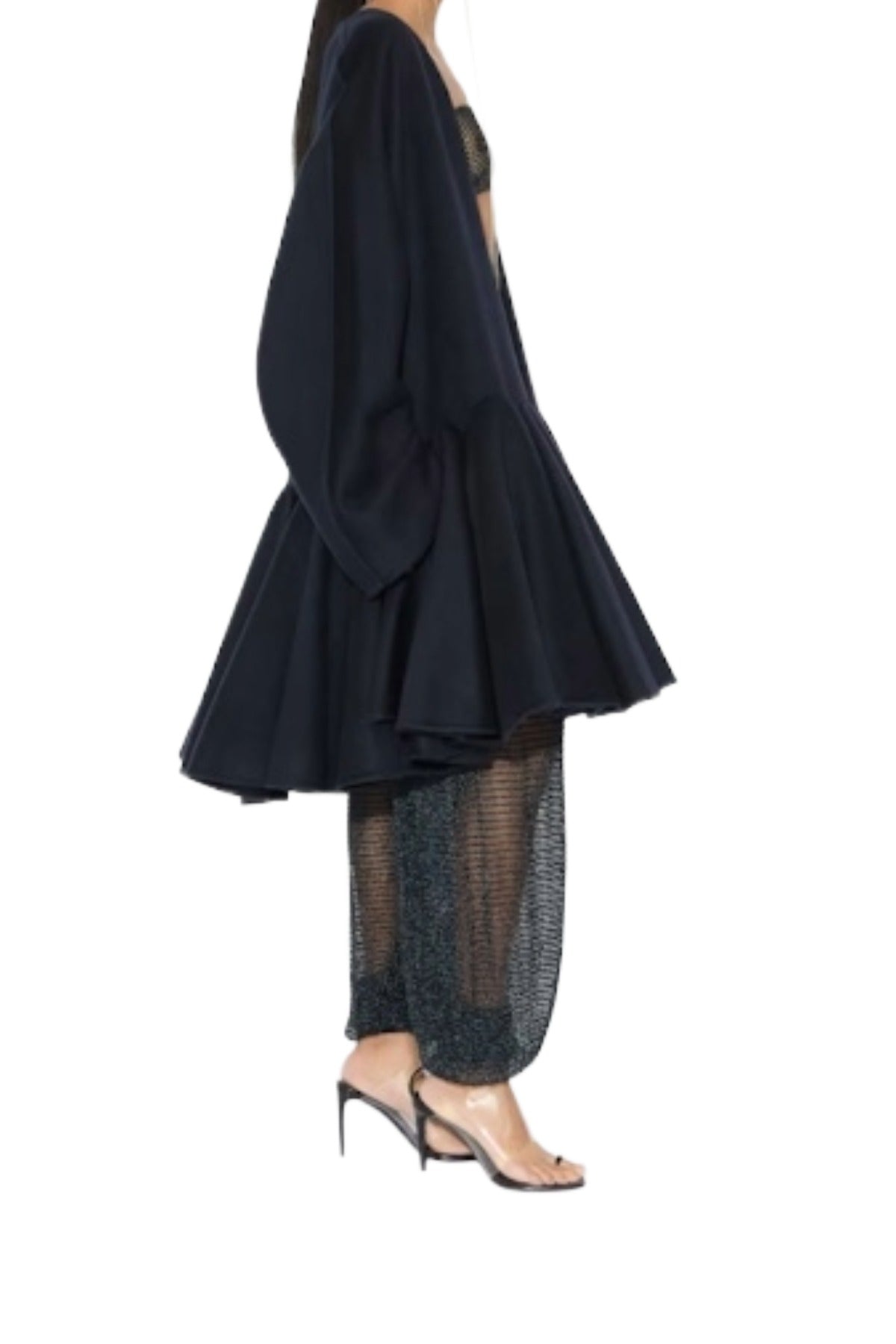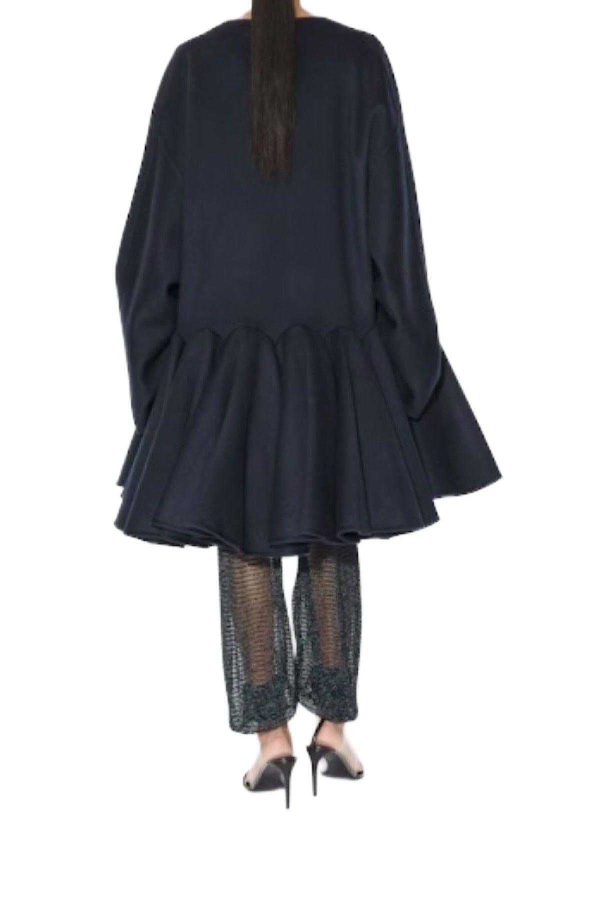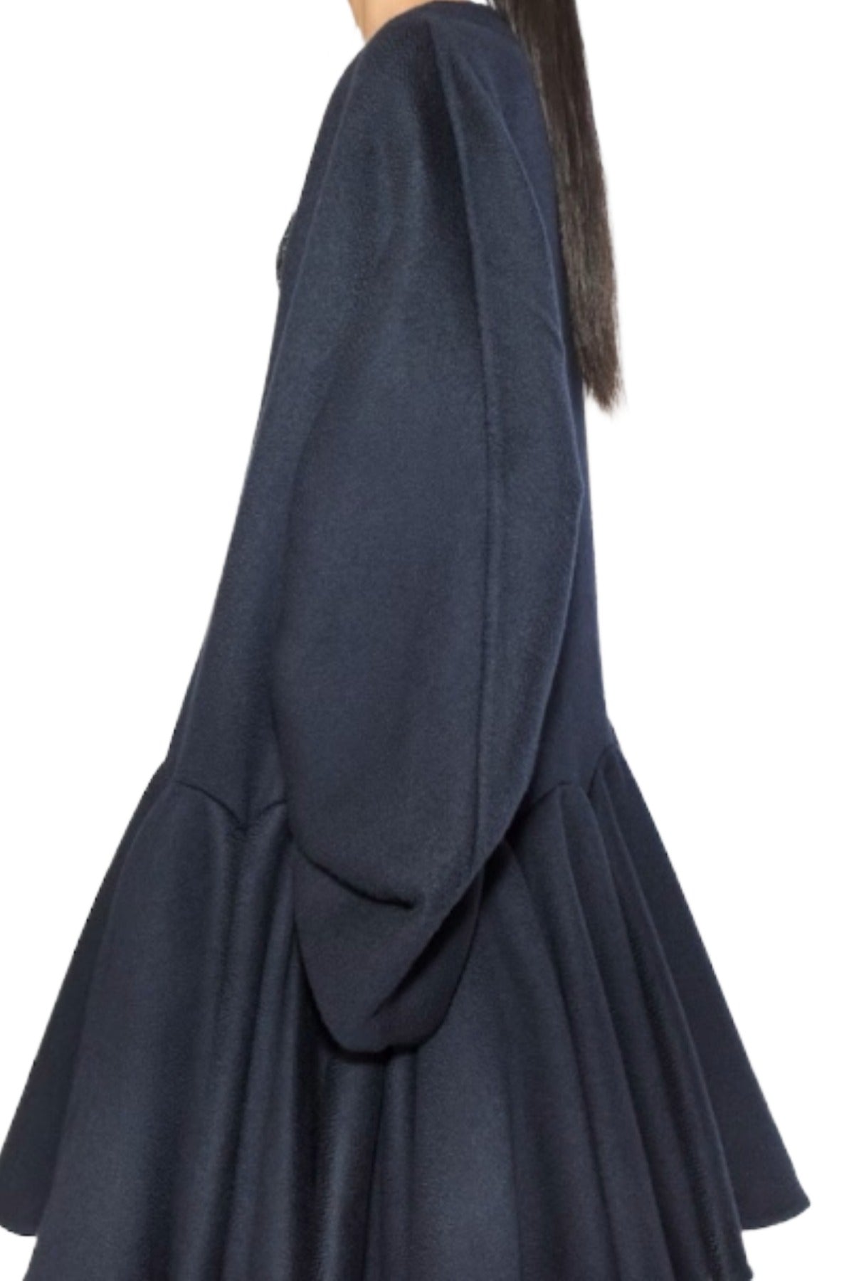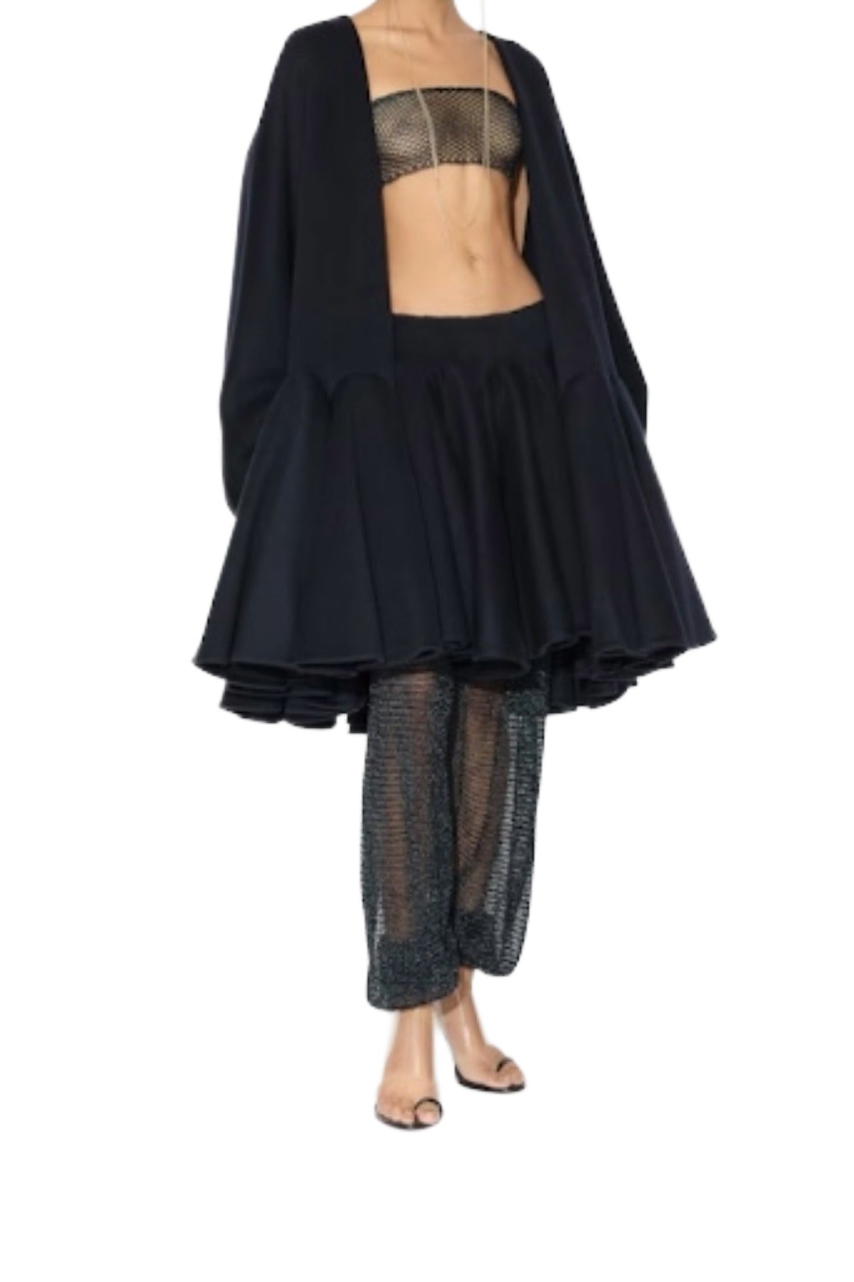 Long sleeves, knee length, voluminous ruffles at the hem Tonal self-tie belt Fit and flare cut |