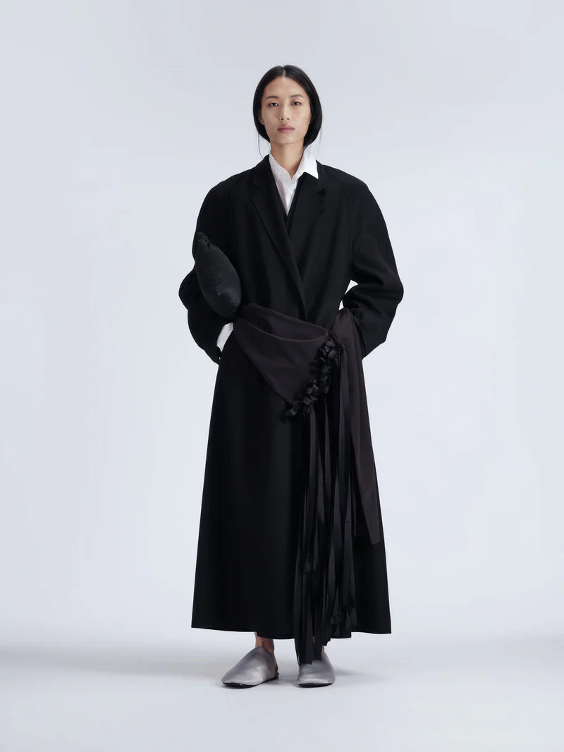 INFO Long wrap coat in deep black light splitable wool. The coat features a fluid sash-belt, finished with hand-knotted silk ribbon fringes. It is assembled by hand following traditional double-face workmanship. |